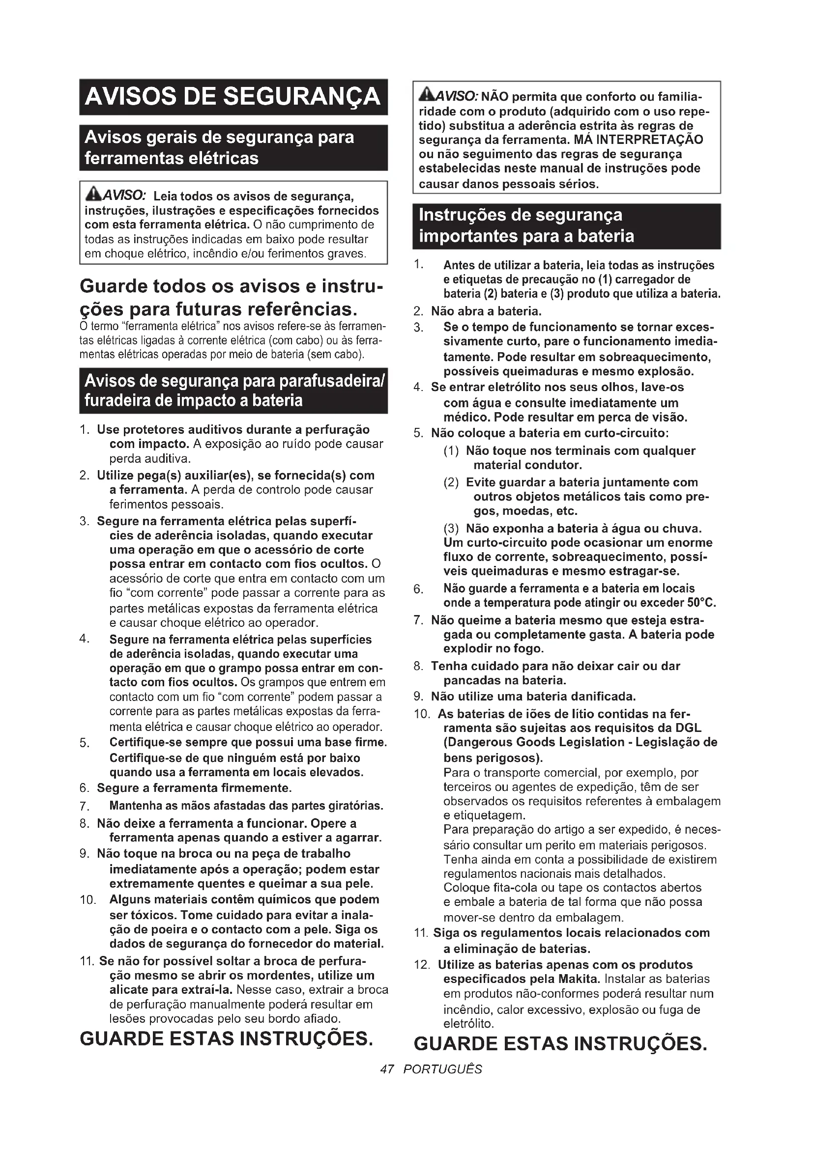 GUARDE ESTAS INSTRUÇÕES. AVISO: NÃO permita que conforto ou familia- ridade com o produto (adquirido com o uso repe- tido) substitua a aderência estrita às regras de segurança da ferramenta. MÁ INTERPRETAÇÃO ou não seguimento das regras de segurança estabelecidas neste manual de instruções pode causar danos pessoais sérios. Instruções de segurança importantes para a bateria
