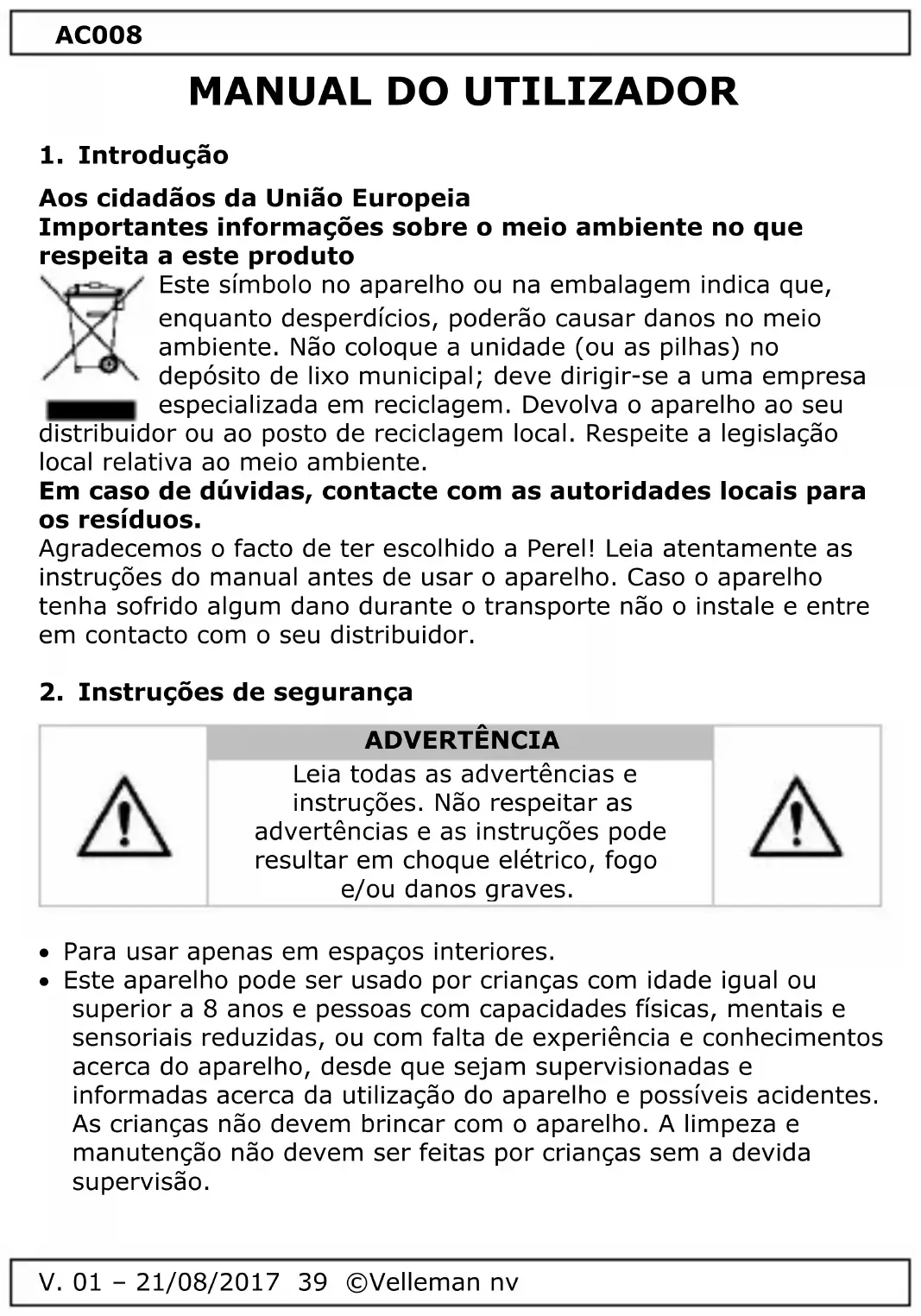 Consulte a Garantia de serviço e qualidade Velleman® na parte final deste manual do utilizador. Familiarize-se com o funcionamento do aparelho antes de o utilizar. Por razões de segurança, estão proibidas quaisquer modificações do aparelho desde que não autorizadas. Os danos causados por modificações não autorizadas do aparelho não estão cobertos pela garantia. Utilize o aparelho apenas para as aplicações descritas neste manual. Todos os outros usos podem levar a um curto-circuito, queimaduras, eletrochoques, de colisão, etc. Utilizar o aparelho de uma forma não autorizada dará origem à anulação da garantia. Danos causados pelo não cumprimento das normas de segurança referidas neste manual anulam a garantia e o seu distribuidor não será responsável por quaisquer danos ou outros problemas daí resultantes. Não ligue o aparelho depois de exposto a variações de temperatura. Para evitar danos, espere que o aparelho atinge a temperatura ambiente. Guarde este manual para posterior consulta.AC008