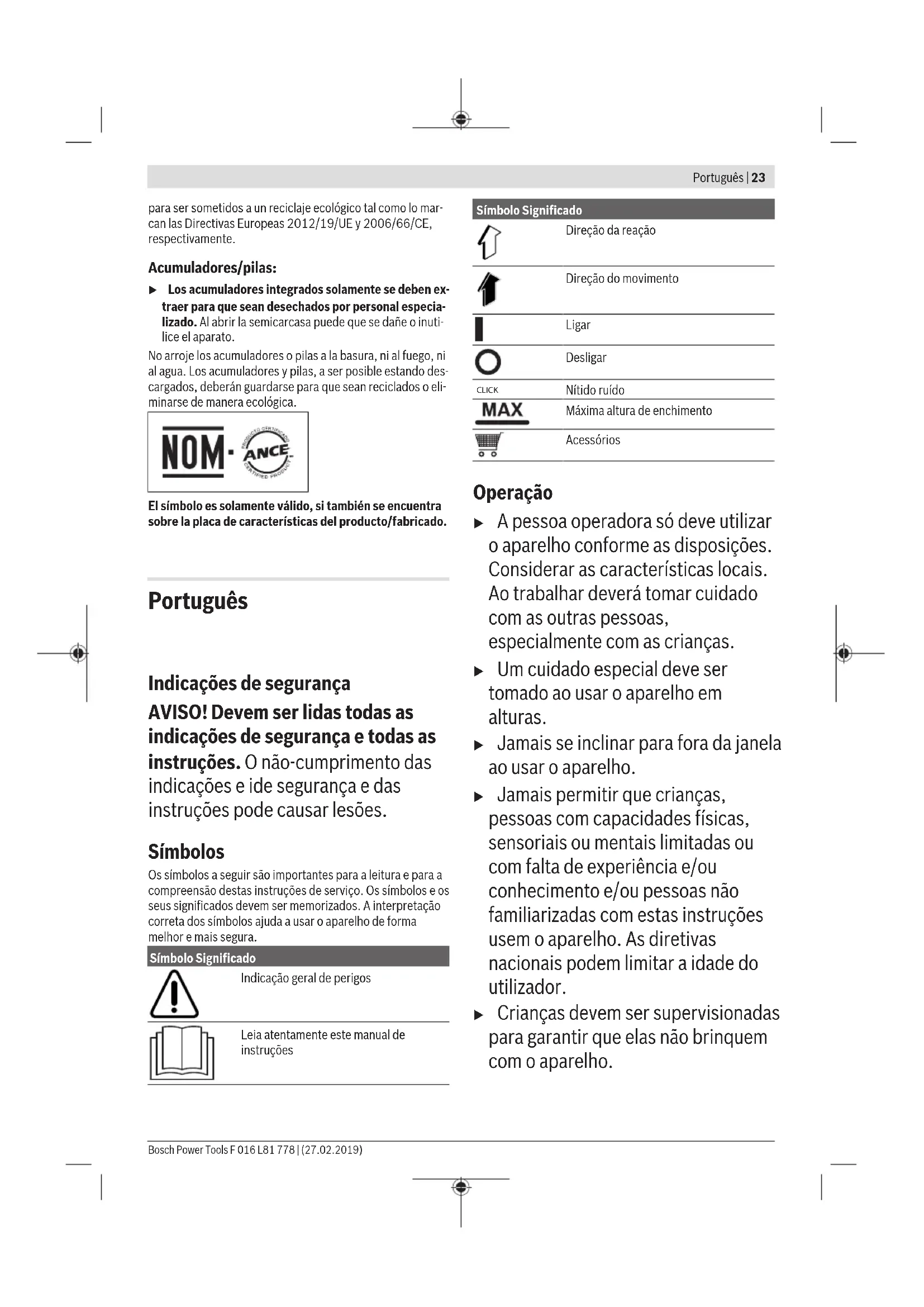 específico para cada país Os acessórios ilustrados ou descritos não fazem parte do volume-padrão de fornecimento do aparelho. Todos os acessórios encontram-se no nosso programa de acessórios. Dados técnicos Aspirador de janelas sem fio GlassVAC Número do produto 3 600 HB7 0.. Potência nominal W 15 Classe de proteção IP X4 Bosch Power Tools F 016 L81 778 | (27.02.2019)26 | Português Aspirador de janelas sem fio GlassVAC Peso conforme EPTA- Procedure 01:2014 kg 0,7 Número de série Vide número de série (placa de identificação) no aparelho Temperatura ambiente permitida – ao carregar °C 0 ... +45 – durante a operação