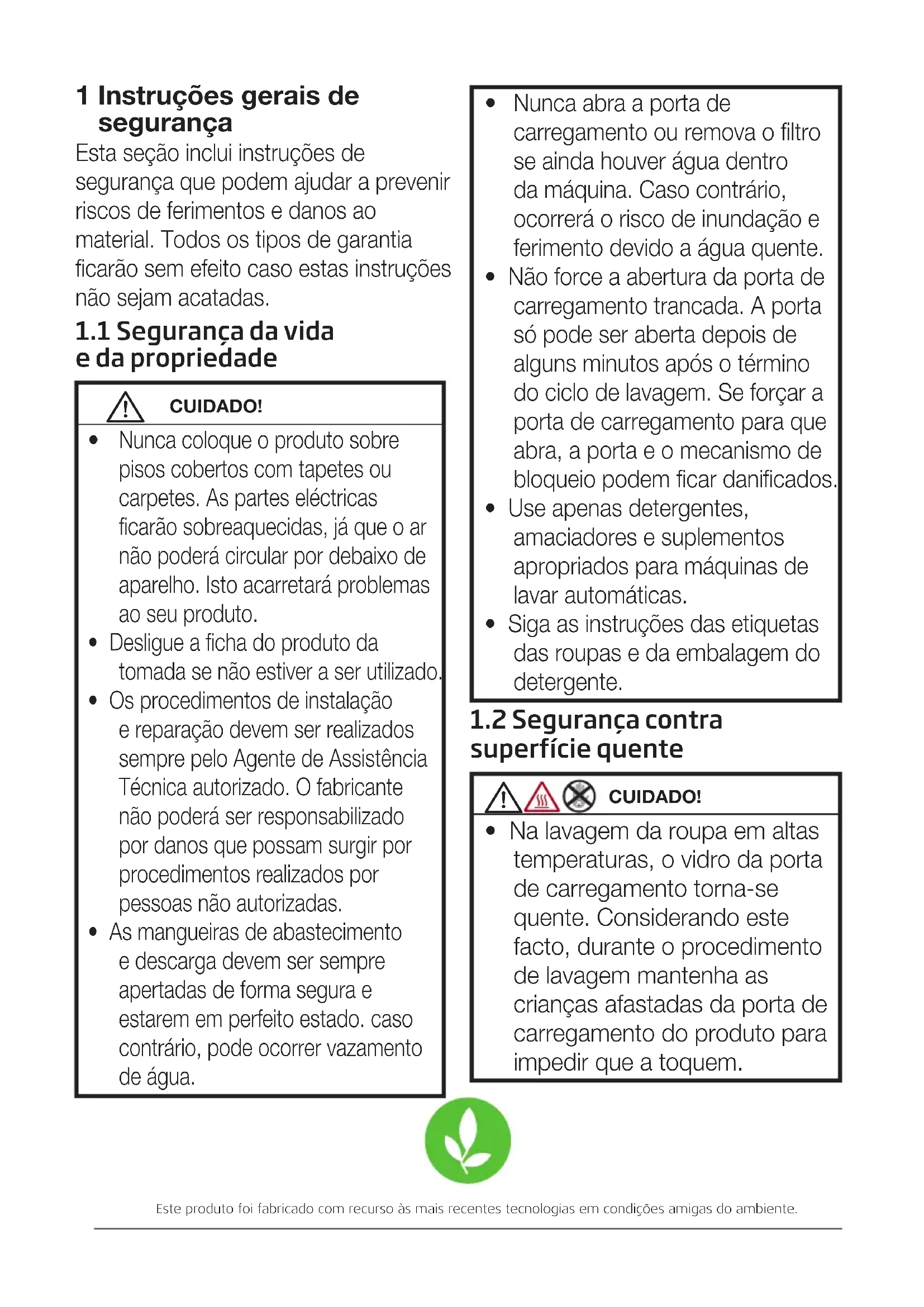 - Na lavagem da roupa em altas temperaturas, o vidro da porta de carregamento torna-se quente. Considerando este facto, durante o procedimento de lavagem mantenha as crianças afastadas da porta de carregamento do produto para impedir que a toquem. Esta seção inclui instruções de segurança que podem ajudar a prevenir riscos de ferimentos e danos ao material. Todos os tipos de garantia ficarão sem efeito caso estas instruções não sejam acatadas.