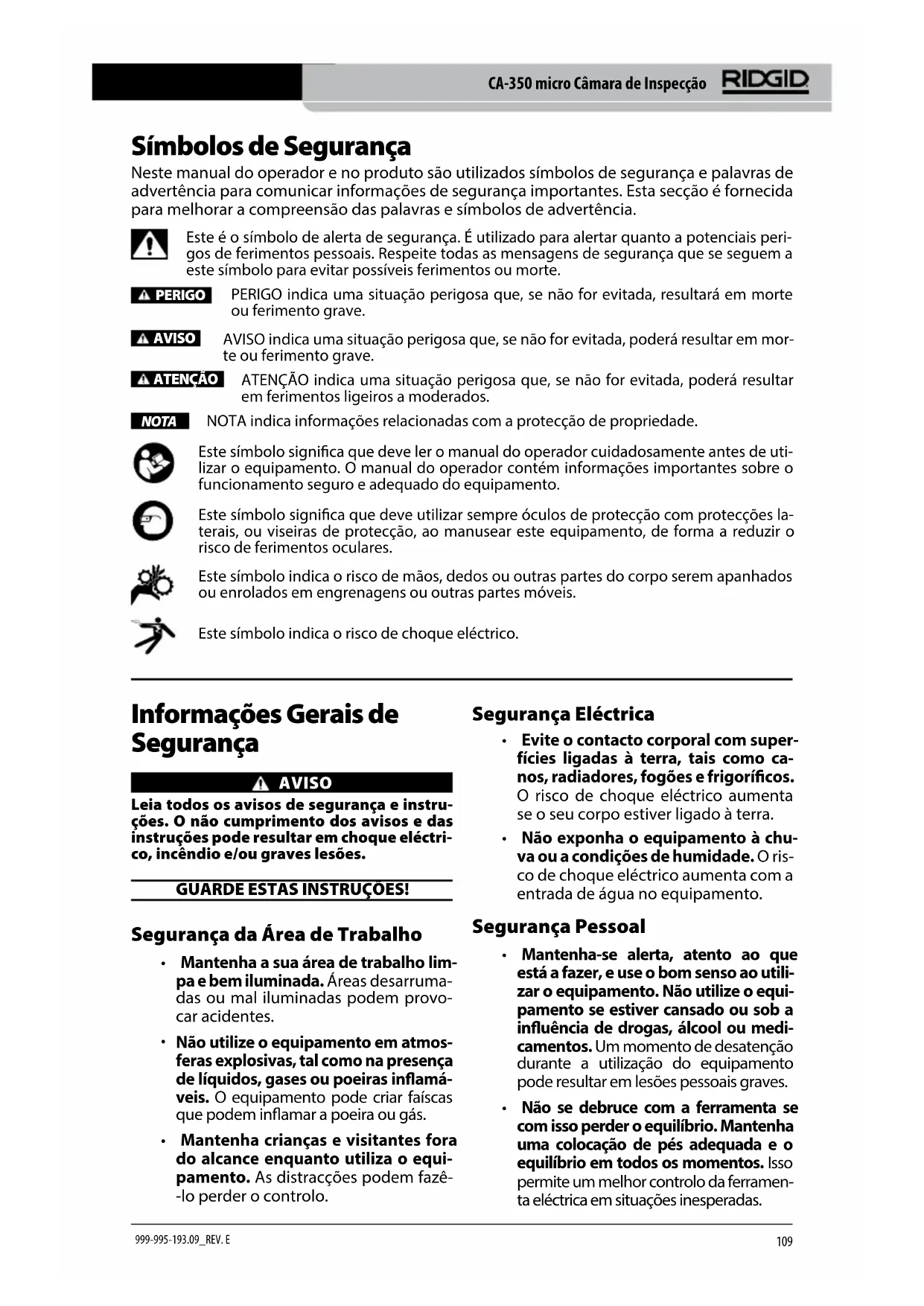 - O equipamento deve ser reparado por um técnico qualicado, utilizan- do apenas peças sobresselentes idên- ticas. Isso garante que a ferramenta se mantém segura. Informações Específicas de Segurança AVISO Esta secção contém informações de segu‑ rança importantes específicas da câmara de inspecção. Leia estas precauções cuidadosamente an‑ tes de utilizar a Câmara de Inspecção CA‑350 micro RIDGID® para reduzir o risco de cho‑ que eléctrico e lesões pessoais graves. GUARDE ESTAS INSTRUÇÕES!CA-350 micro Câmara de Inspecção