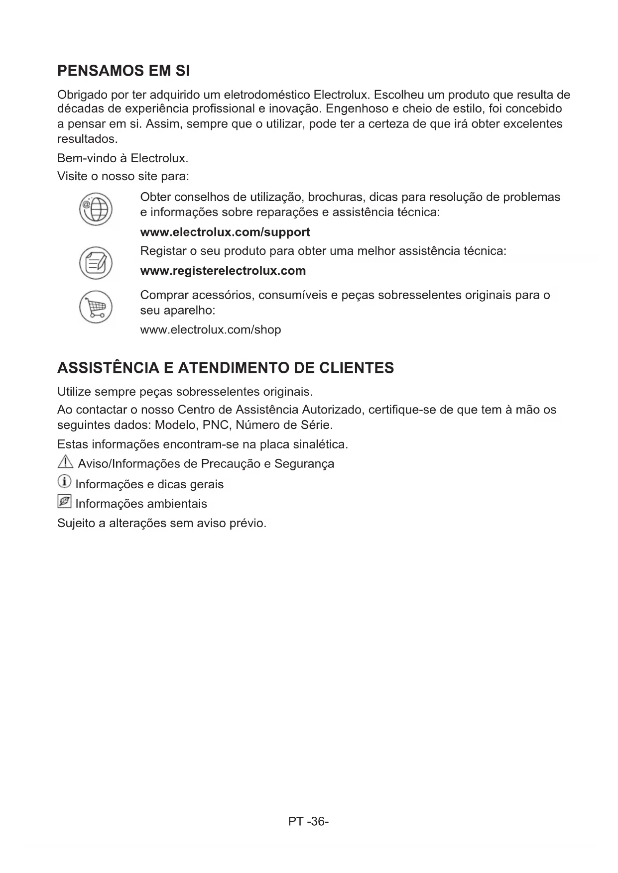 Obrigado por ter adquirido um eletrodoméstico Electrolux. Escolheu um produto que resulta de décadas de experiência profissional e inovação. Engenhoso e cheio de estilo, foi concebido a pensar em si. Assim, sempre que o utilizar, pode ter a certeza de que irá obter excelentes resultados. Bem-vindo à Electrolux. Visite o nosso site para: Obter conselhos de utilização, brochuras, dicas para resolução de problemas e informações sobre reparações e assistência técnica: www.electrolux.com/support Registar o seu produto para obter uma melhor assistência técnica: www.registerelectrolux.com Comprar acessórios, consumíveis e peças sobresselentes originais para o seu aparelho: www.electrolux.com/shop
