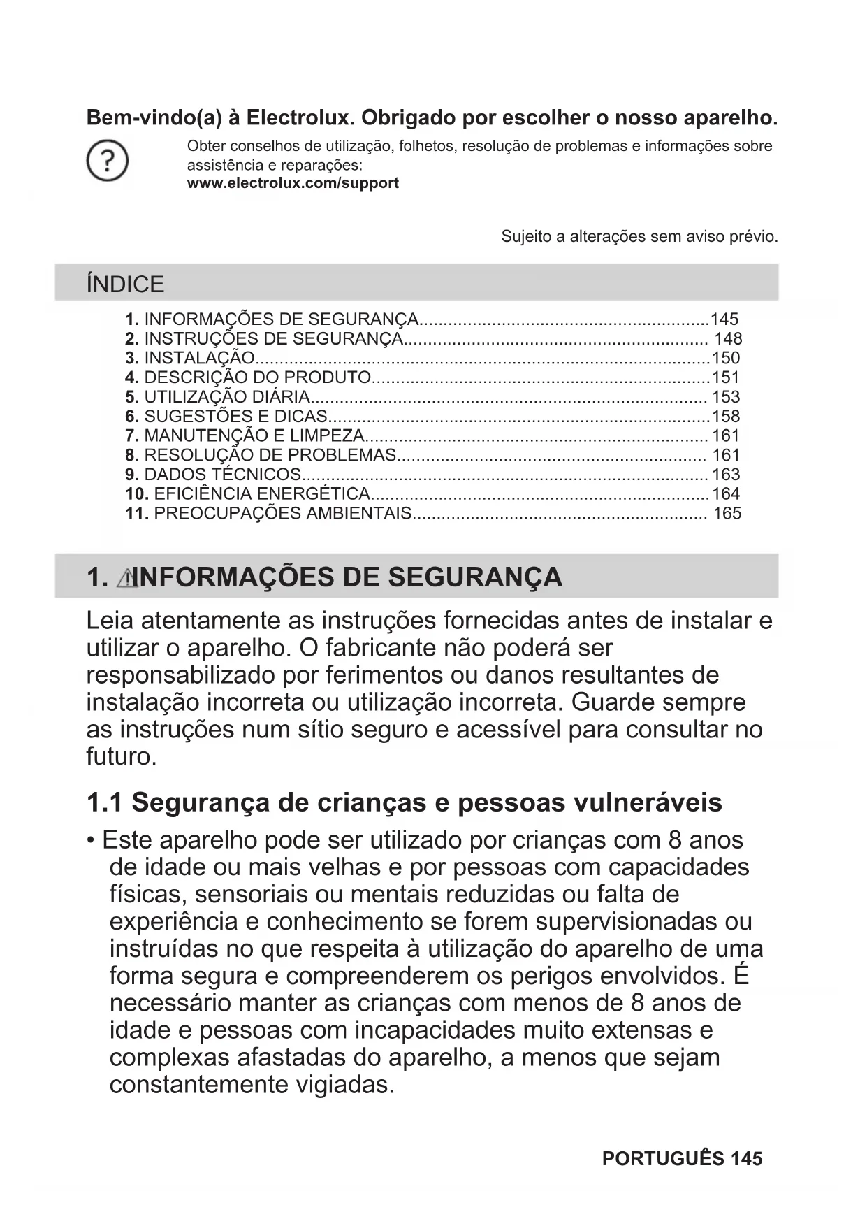 Recicle os materiais que apresentem o símbolo . Coloque a embalagem nos contentores indicados para reciclagem. Ajude a proteger o ambiente e a saúde pública através da reciclagem dos aparelhos eléctricos e electrónicos. Não elimine os aparelhos que tenham o símbolo juntamente com os resíduos domésticos. Coloque o produto num ponto de recolha para reciclagem local ou contacte as suas autoridades municipais. PORTUGUÊS 165Velkommen til Electrolux! Takk for at du valgte produktet vårt. Table title.Få råd om bruk, brosjyrer, hjelp til feilsøking, og informasjon om service ogreparasjon:www.electrolux.com/supportMed forbehold om endringer. INNHOLD