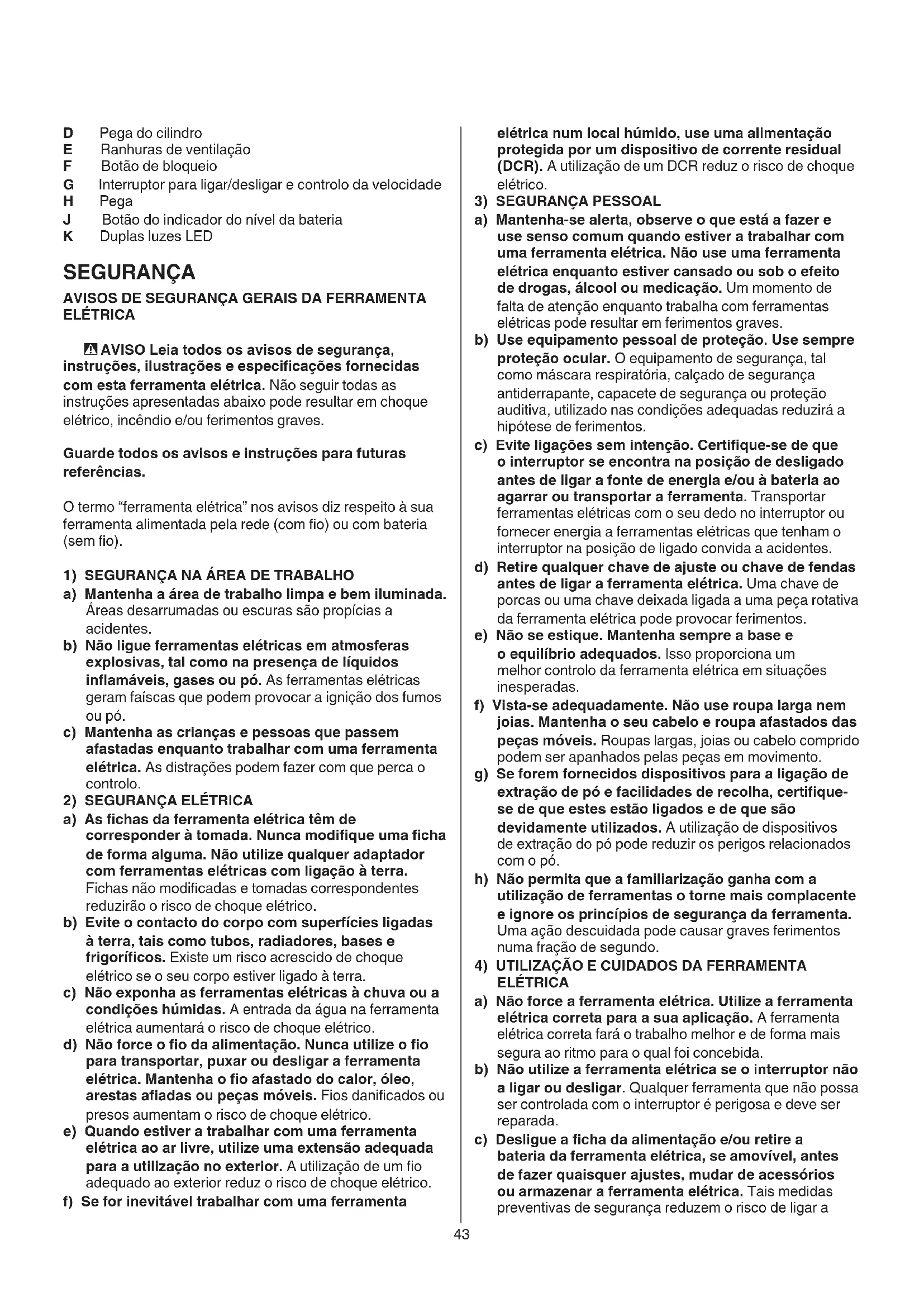 J Botão do indicador do nível da bateria K Duplas luzes LED SEGURANÇA AVISOS DE SEGURANÇA GERAIS DA FERRAMENTA ELÉTRICA - AVISO Leia todos os avisos de segurança, instruções, ilustrações e especicações fornecidas com esta ferramenta elétrica. Não seguir todas as instruções apresentadas abaixo pode resultar em choque elétrico, incêndio e/ou ferimentos graves. Guarde todos os avisos e instruções para futuras referências. O termo “ferramenta elétrica” nos avisos diz respeito à sua ferramenta alimentada pela rede (com o) ou com bateria (sem o).