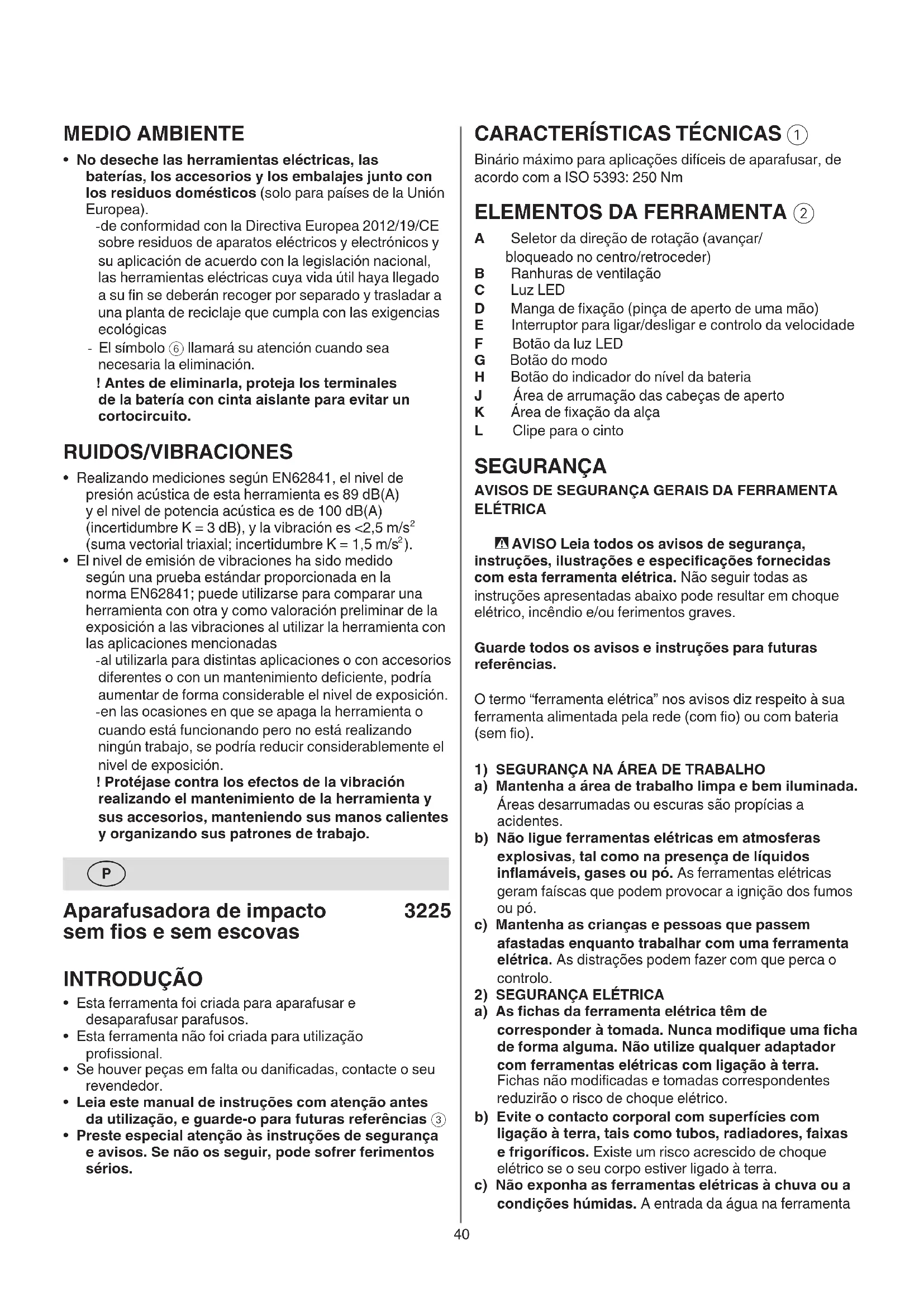 - Preste especial atenção às instruções de segurança e avisos. Se não os seguir, pode sofrer ferimentos sérios.41 elétrica correta fará o trabalho melhor e de forma mais segura ao ritmo para o qual foi concebida. b) Não utilize a ferramenta elétrica se o interruptor não a ligar ou desligar. Qualquer ferramenta que não possa ser controlada com o interruptor é perigosa e deve ser reparada. c) Desligue a cha da alimentação e/ou retire a bateria da ferramenta elétrica, se amovível, antes de fazer quaisquer ajustes, mudar de acessórios ou armazenar a ferramenta elétrica. Estas medidas de segurança preventiva ajudam a reduzir os riscos de ligar inadvertidamente a ferramenta elétrica. d) Guarde as ferramentas elétricas não utilizadas fora do alcance das crianças e não permita que pessoas não familiarizadas com a ferramenta elétrica ou com estas instruções utilizem a ferramenta elétrica. As ferramentas elétricas são perigosas nas mãos de utilizadores sem formação. e) Proceda à manutenção das ferramentas elétricas e acessórios. Verique desalinhamentos ou bloqueios das peças móveis, peças partidas e quaisquer outras condições que possam afetar o funcionamento da ferramenta elétrica. Se estiver danicada, leve a ferramenta elétrica para ser reparada antes da utilização. Muitos acidentes são provocados pela fraca manutenção das ferramentas elétricas. f) Mantenha as ferramentas de corte aadas e limpas. Ferramentas de corte devidamente mantidas e com arestas de corte aadas têm uma menor probabilidade de prender e são mais fáceis de controlar. g) Use a ferramenta elétrica, acessórios e brocas, etc., de acordo com estas instruções, tendo em conta as condições de trabalho e o trabalho a ser efetuado. A utilização da ferramenta elétrica para operações diferentes daquelas para que foi criada pode dar origem a uma situação perigosa. h) Mantenha as pegas e superfícies de segurar secas, limpas e sem óleo ou gordura. Pegas e superfícies de segurar escorregadias não permitem o manuseamento seguro nem o controlo da ferramenta em situações inesperadas.