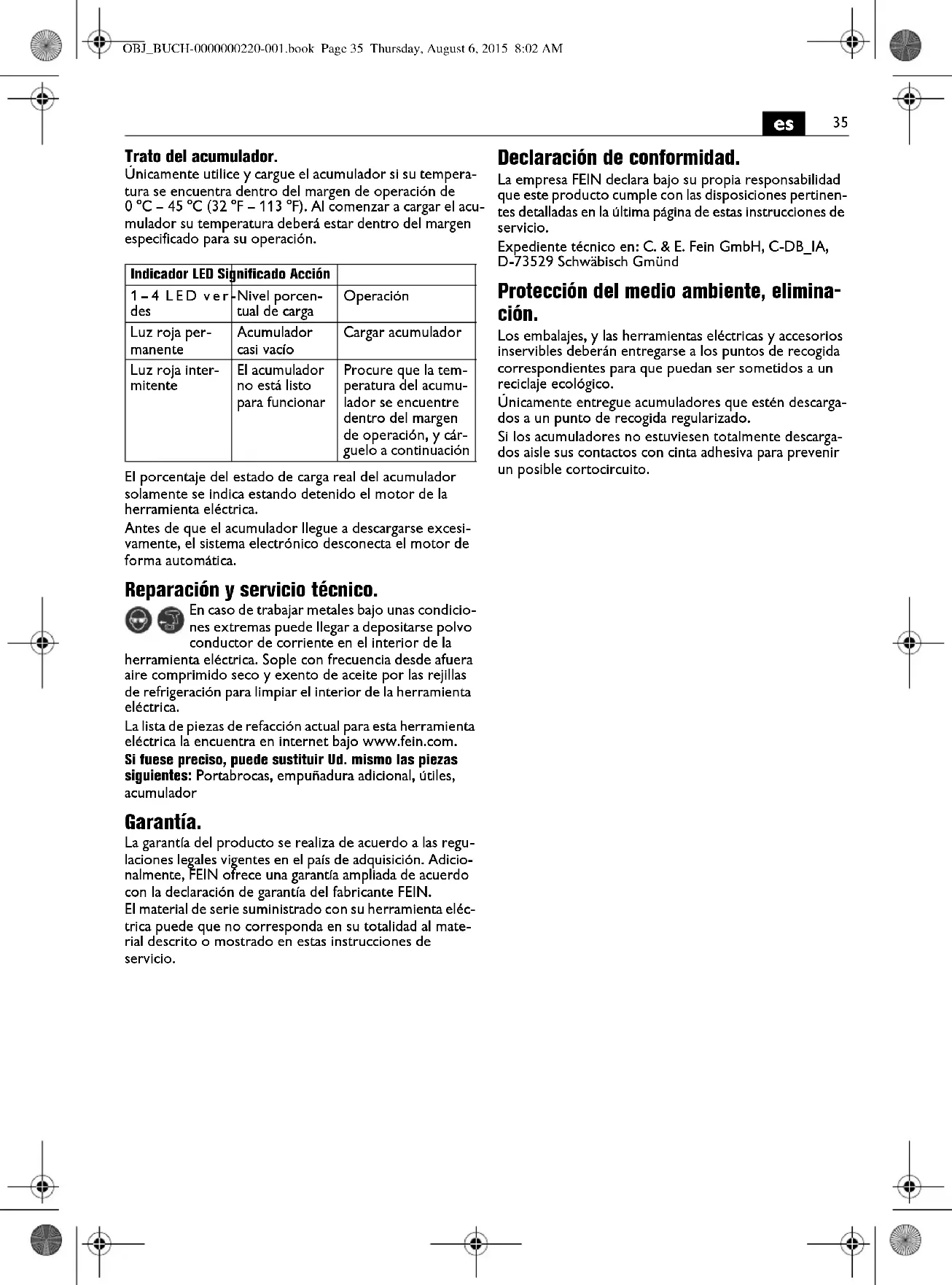 Manuseio com o acumulador. O acumulador só deve ser utilizado e carregado numa faixa de temperatura operacional de 0 °C – 45 °C (32 °F – 113 °F). Antes do processo de carga é necessário que a temperatura do acumulador esteja na faixa de tempera- tura operacional do acumulador. O verdadeiro porcentual do estado de carga do acumula- dor só é indicado quando o motor da ferramenta elétrica está parado. Se houver uma descarga total do acumulador, a eletrónica pára automaticamente o motor. Manutenção e serviço pós-venda. No caso de aplicações extremas, é possível que durante o processamento de metais se depo- site pó condutivo no interior da ferramenta elétrica. Soprar frequentemente o interior da ferramenta elétrica, pelas aberturas de ventilação, com ar compri- mido seco e livre de óleo. A atual lista de peças sobressalentes desta ferramenta elé- trica se encontra na internet em www.fein.com. As seguintes peças podem ser substituídas pelo utente: Mandril de brocas, punho adicional, ferramentas de traba- lho, acumulador Garantia de evicção e garantia. A garantia de evicção para este produto é válida con- forme as regras legais no país onde é colocado em funcio- namento. Além disso, a FEIN oferece uma garantia conforme a declaração de garantia do fabricante FEIN. É possível que o volume de fornecimento da sua ferra- menta elétrica só contenha uma parte dos acessórios des- critos ou ilustrados nesta instrução de serviço. Declaração de conformidade. A firma FEIN declara, em responsabilidade exclusiva, que este produto corresponde às respectivas especificações indicadas na última página desta instrução de serviço. Documentação técnica em: C. & E. Fein GmbH, C-DB_IA, D-73529 Schwäbisch Gmünd Proteção do meio ambiente, eliminação. Embalagens, ferramentas elétricas a serem deitadas fora e acessórios velhos devem ser encaminhados a uma recicla- gem ecológica. Os acumuladores só devem ser eliminados corretamente se estiverem completamente descarregados. No caso de acumuladores que não estiverem completa- mente descarregados, os contactos deverão ser isolados preventivamente com fitas adesivas de modo que não ocorram curto-circuitos. Indicação LED Significado Ação 1–4 LEDs verdes Estado de carga porcentual Funcionamento Luz contínua vermelha O acumulador está quase vazio Carregar o acumu- lador Luz vermelha intermitente O acumulador não está pronto para funcionar O acumulador deve estar na sua faixa de temperatura opera- cional antes de ser carregado OBJ_BUCH-0000000220-001.book Page 39 Thursday, August 6, 2015 8:02 AM40