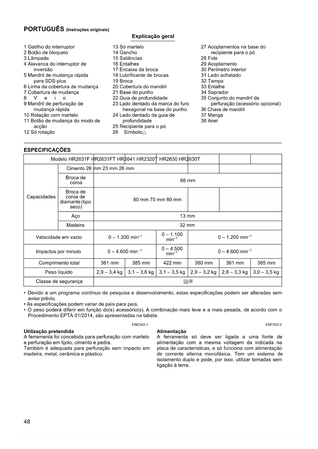 - O peso poderá diferir em função do(s) acessório(s). A combinação mais leve e a mais pesada, de acordo com o Procedimento EPTA 01/2014, são apresentadas na tabela. ENE042-1 Utilização pretendida A ferramenta foi concebida para perfuração com martelo e perfuração em tijolo, cimento e pedra. Também é adequada para perfuração sem impacto em madeira, metal, cerâmica e plástico. ENF002-2 Alimentação A ferramenta só deve ser ligada a uma fonte de alimentação com a mesma voltagem da indicada na placa de características, e só funciona com alimentação de corrente alterna monofásica. Tem um sistema de isolamento duplo e pode, por isso, utilizar tomadas sem ligação à terra. Modelo HR2631F HR2631FT HR2641 HR2320T HR2630 HR2630T Capacidades Cimento 26 mm 23 mm 26 mm Broca de coroa 68 mm Broca de coroa de diamante (tipo seco) 80 mm 70 mm 80 mm Aço 13 mm Madeira 32 mm Velocidade em vazio 0 – 1.200 min