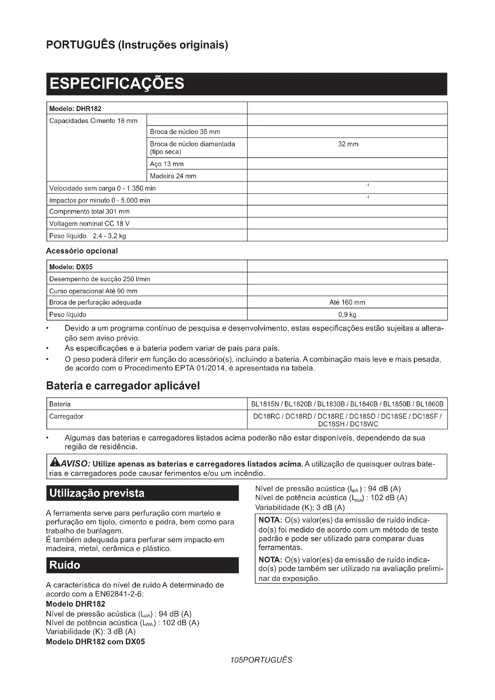- Algumasdasbateriasecarregadoreslistadosacimapoderãonãoestardisponíveis,dependendodasua regiãoderesidência. AVISO: Utilize apenas as baterias e carregadores listados acima. A utilização de quaisquer outras bate- riasecarregadorespodecausarferimentose/ouumincêndio. Utilização prevista A ferramenta serve para perfuração com martelo e perfuraçãoemtijolo,cimentoepedra,bemcomopara trabalho de burilagem. É também adequada para perfurar sem impacto em madeira,metal,cerâmicaeplástico. Ruído AcaracterísticadonívelderuídoAdeterminadode acordo com a EN62841-2-6: Modelo DHR182 Níveldepressãoacústica(L