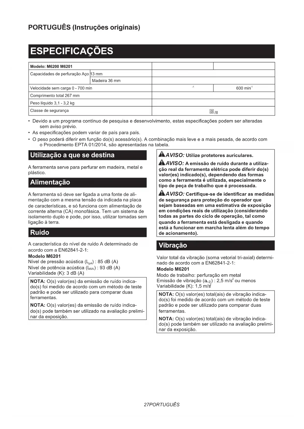 ) : 93 dB (A) Variabilidade (K): 3 dB (A) NOTA: O(s) valor(es) da emissão de ruído indica- do(s) foi medido de acordo com um método de teste padrão e pode ser utilizado para comparar duas ferramentas. NOTA: O(s) valor(es) da emissão de ruído indica- do(s) pode também ser utilizado na avaliação prelimi- nar da exposição. AVISO: Utilize protetores auriculares. AVISO: A emissão de ruído durante a utiliza- ção real da ferramenta elétrica pode diferir do(s) valor(es) indicado(s), dependendo das formas como a ferramenta é utilizada, especialmente o tipo de peça de trabalho que é processada. AVISO: Certique-se de identicar as medidas de segurança para proteção do operador que sejam baseadas em uma estimativa de exposição em condições reais de utilização (considerando todas as partes do ciclo de operação, tal como quando a ferramenta está desligada e quando está a funcionar em marcha lenta além do tempo de acionamento). Vibração Valor total da vibração (soma vetorial tri-axial) determi- nado de acordo com a EN62841-2-1: Modelo M6201 Modo de trabalho: perfuração em metal Emissão de vibração (a h,D ) : 2,5 m/s