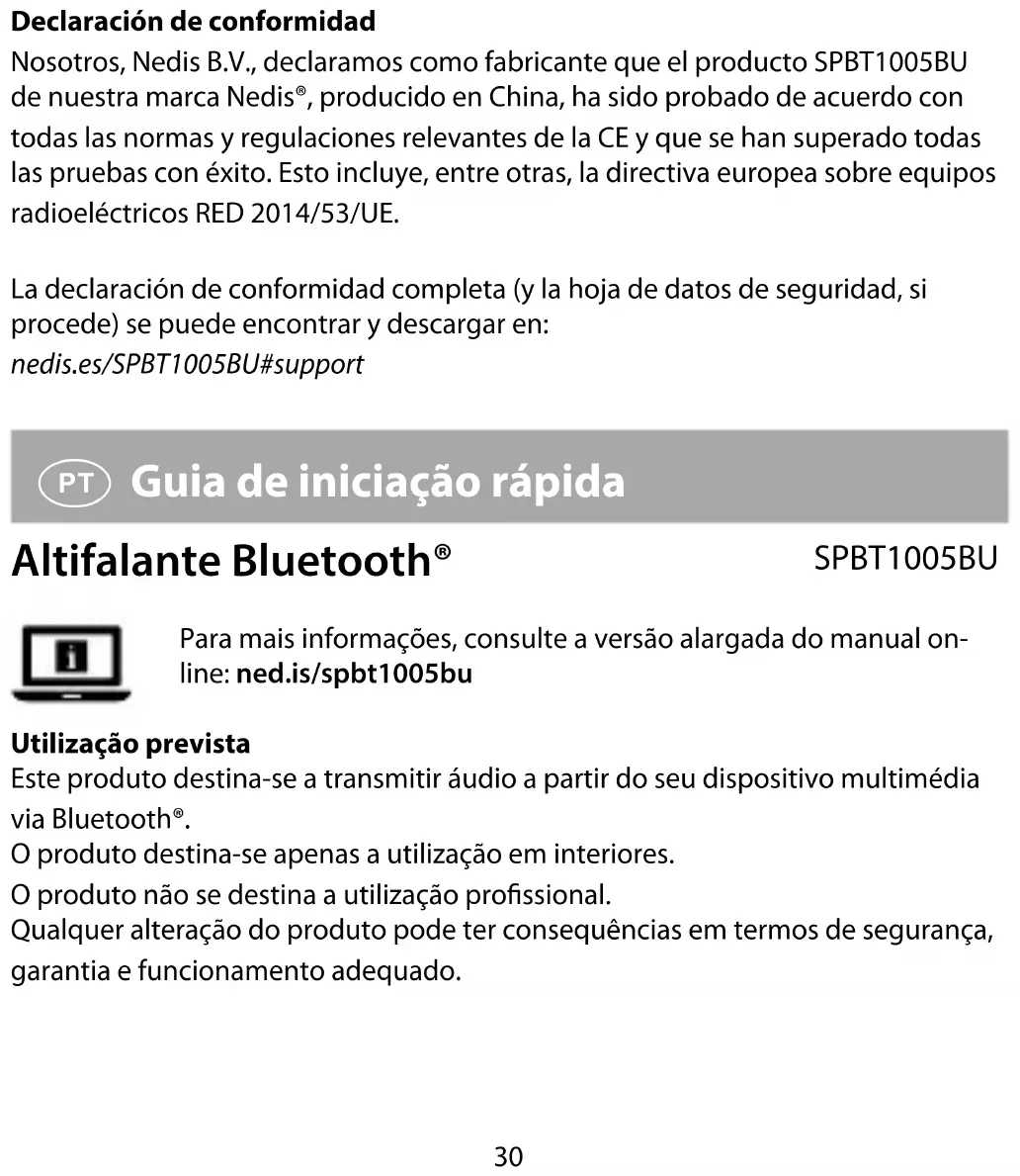 para reproduzir a música ou colocá- la em pausa. Também pode controlar a música e o volume a partir da sua fonte de áudio.34 Eliminação O produto deve ser eliminado separadamente num ponto de recolha apropriado. Não elimine este produto juntamente com o lixo doméstico. Para obter mais informações, contacte o revendedor ou o organismo local responsável pela gestão de resíduos. Declaração de conformidade A Nedis B.V. declara, na qualidade de fabricante, que o produto SPBT1005BU da nossa marca Nedis®, produzido na China, foi testado em conformidade com todas as normas e regulamentos CE relevantes e que todos os testes foram concluídos com sucesso. Os mesmos incluem, entre outros, o regulamento RED 2014/53/UE. A Declaração de conformidade (e a cha de dados de segurança, se aplicável) pode ser consultada e descarregada em: nedis.pt/SPBT1005BU#support
