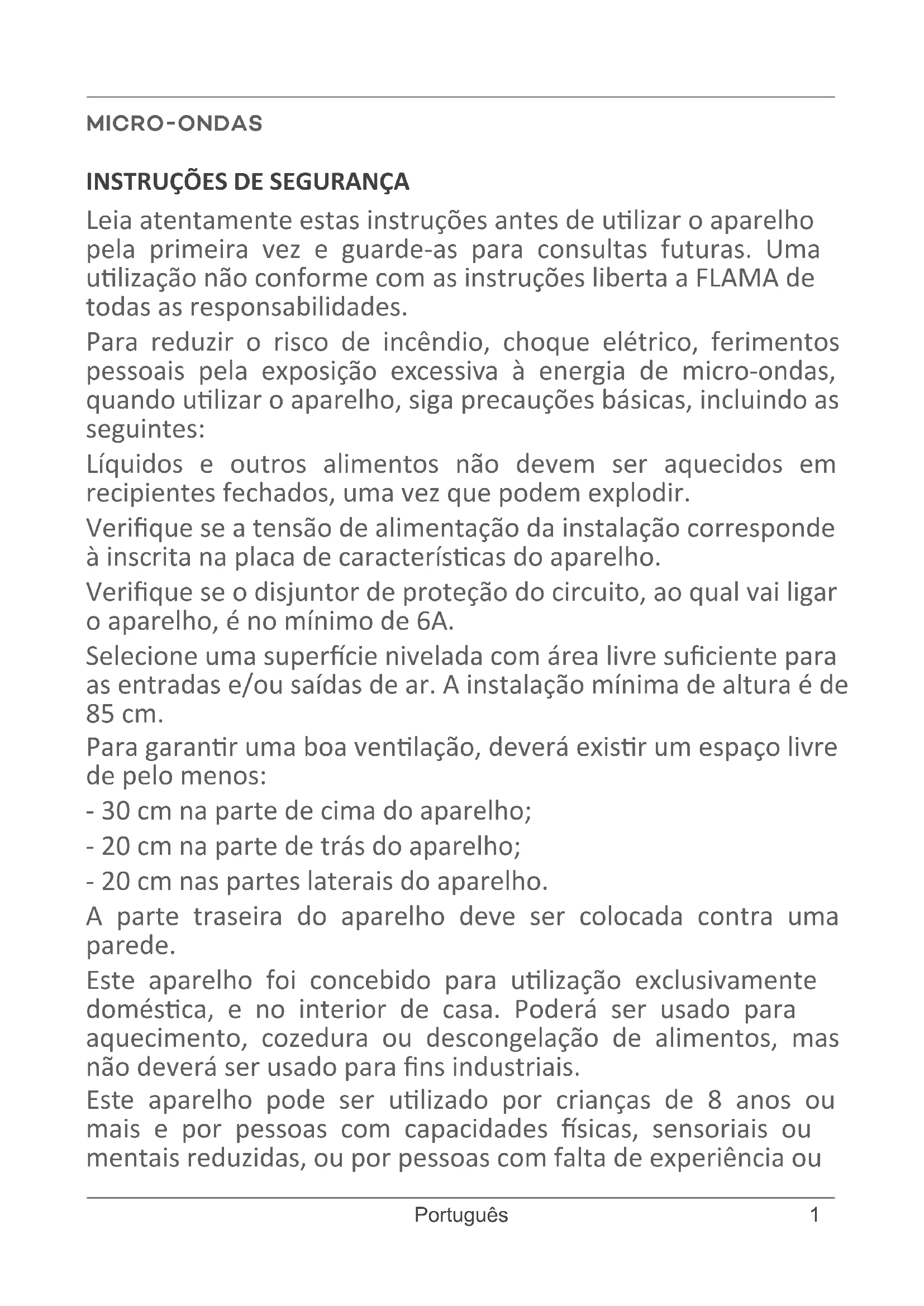 Leia atentamente estas instruções antes de ulizar o aparelho pela primeira vez e guarde-as para consultas futuras. Uma ulização não conforme com as instruções liberta a FLAMA de todas as responsabilidades. Para reduzir o risco de incêndio, choque elétrico, ferimentos pessoais pela exposição excessiva à energia de micro-ondas, quando ulizar o aparelho, siga precauções básicas, incluindo as seguintes: Líquidos e outros alimentos não devem ser aquecidos em recipientes fechados, uma vez que podem explodir. Verique se a tensão de alimentação da instalação corresponde à inscrita na placa de caracteríscas do aparelho. Verique se o disjuntor de proteção do circuito, ao qual vai ligar o aparelho, é no mínimo de 6A. Selecione uma supercie nivelada com área livre suciente para as entradas e/ou saídas de ar. A instalação mínima de altura é de 85 cm. Para garanr uma boa venlação, deverá exisr um espaço livre de pelo menos: - 30 cm na parte de cima do aparelho; - 20 cm na parte de trás do aparelho; - 20 cm nas partes laterais do aparelho. A parte traseira do aparelho deve ser colocada contra uma parede. Este aparelho foi concebido para ulização exclusivamente domésca, e no interior de casa. Poderá ser usado para aquecimento, cozedura ou descongelação de alimentos, mas não deverá ser usado para ns industriais. Este aparelho pode ser ulizado por crianças de 8 anos ou mais e por pessoas com capacidades sicas, sensoriais ou mentais reduzidas, ou por pessoas com falta de experiência ou MICRO-ONDAS2 www.ama.pt conhecimento, se verem do formação ou instrução em relação à ulização do aparelho de forma segura e compreenderem os perigos envolvidos. As crianças não deverão brincar com o aparelho. A limpeza e manutenção não devem ser feitas por crianças a menos que sejam maiores de 8 anos e supervisionados. Mantenha o aparelho e a sua extensão longe do alcance de crianças com menos de 8 anos. Não coloque o micro-ondas a funcionar em vazio pois poderá danicar o aparelho. Ulize apenas utensílios adequados para ulização em micro- ondas. Para assegurar que os mesmos são adequados coloque no micro-ondas o utensílio vazio juntamente com um copo com água, selecionando a potência máxima para 60 segundos. Se o utensílio car muito quente não deverá ser usado. O aparelho deve ser limpo regularmente e qualquer depósito de comida deverá ser removido. Leia e siga atentamente as “Precauções para evitar possível exposição a energia excessiva de micro-ondas “. Quando aquecer alimentos em recipientes de plásco ou de papel, vigie a operação, devido à possibilidade de ignição. Golpeie os alimentos com casca grossa tais como batatas, abóboras inteiras, maças, castanhas ou outros, antes de os confecionar. Não frite alimentos no micro-ondas. O óleo pode danicar os componentes de aparelho e provocar queimaduras no ulizador. Durante o funcionamento do micro-ondas os recipientes poderão aquecer devido ao calor transmido pelos alimentos. Poderá ser necessário para o seu manuseamento a ulização de pegas. Se vericar a existência de fumo no interior, desligue o micro- ondas, rere a cha da tomada e mantenha a porta fechada de modo a abafar quaisquer chamas que existam no interior. Não cozinhe demasiado a comida. Não ulize a cavidade do micro-ondas para armazenar alimentos.3 Português Não deixe produtos de papel, utensílios de cozinha ou alimentos na cavidade quando o aparelho não esver a ser ulizado. A limpeza do micro-ondas, nomeadamente das zonas de vedação, da cavidade ou outras partes deverá ser efetuada conforme indicado nas instruções de Limpeza e Manutenção. Rere agrafos e outros componentes metálicos dos sacos de papel ou de pláscos antes de os colocar no micro-ondas. Instale ou coloque o aparelho de acordo com as instruções do capítulo “Instalação”. Os ovos (crus ou cozidos) com casca não deverão ser aquecidos no micro-ondas uma vez que podem rebentar, mesmo após o nal da confeção. Este aparelho é desnado a ser ulizado em aplicações doméscas e análogas tais como: - Áreas de cozinha reservadas ao pessoal de lojas, ocinas e outros ambientes prossionais, - Casas de campo, - Por clientes de hotéis, motéis e outros ambientes de carácter residencial - Ambientes do po quarto de hotel Não use ou armazene o aparelho no exterior. Não use o aparelho perto de água, em ambientes húmidos (cave) ou perto de uma piscina. A temperatura das supercies acessíveis pode ser alta quando o aparelho está em funcionamento. As supercies podem estar quentes durante o funcionamento do aparelho. As crianças deverão ser mandas à distância. Mantenha o cabo de alimentação afastado das supercies quentes e não cubra os sistemas de venlação do aparelho. Não deixe o cabo pendurado na borda de uma mesa ou balcão. A falta de limpeza do micro-ondas poderá levar à deterioração das supercies, podendo reduzir o tempo de vida do aparelho e possivelmente resultar em situações de perigo.4 www.ama.pt O conteúdo de biberões e boiões de comida para bebé deve ser mexido ou agitado e a temperatura vericada antes do seu consumo, para evitar queimaduras. O aquecimento por micro-ondas de bebidas pode resultar em ebulição erupva retardada, portanto é preciso ter cuidado ao manusear o recipiente. O aparelho não se desna à ulização por pessoas (incluindo crianças) com capacidades sicas, sensoriais ou capacidades mentais, ou falta de experiência e conhecimento, a não ser que lhes tenha sido dada supervisão ou instruções sobre o uso do aparelho por uma pessoa responsável pela sua segurança. As crianças devem ser vigiadas para garanr que não brincam com o aparelho. O aparelho não é desnado a ser posto em funcionamento por meio de um temporizador externo ou por um sistema separado de comando à distância. Não deverá ser usada limpeza a vapor. Durante a ulização o aparelho aquece. É necessário extremo