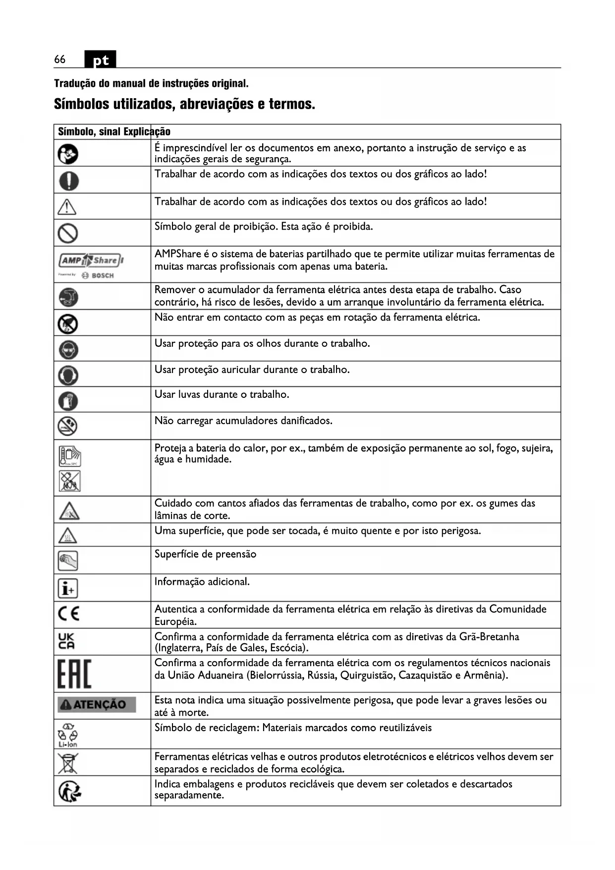 Tradução do manual de instruções original. Símbolos utilizados, abreviações e termos. Símbolo, sinal Explicação É imprescindível ler os documentos em anexo, portanto a instrução de serviço e as indicações gerais de segurança. Trabalhar de acordo com as indicações dos textos ou dos gráficos ao lado! Trabalhar de acordo com as indicações dos textos ou dos gráficos ao lado! Símbolo geral de proibição. Esta ação é proibida. AMPShare é o sistema de baterias partilhado que te permite utilizar muitas ferramentas de muitas marcas profissionais com apenas uma bateria. Remover o acumulador da ferramenta elétrica antes desta etapa de trabalho. Caso contrário, há risco de lesões, devido a um arranque involuntário da ferramenta elétrica. Não entrar em contacto com as peças em rotação da ferramenta elétrica. Usar proteção para os olhos durante o trabalho. Usar proteção auricular durante o trabalho. Usar luvas durante o trabalho. Não carregar acumuladores danificados. Proteja a bateria do calor, por ex., também de exposição permanente ao sol, fogo, sujeira, água e humidade. Cuidado com cantos afiados das ferramentas de trabalho, como por ex. os gumes das lâminas de corte. Uma superfície, que pode ser tocada, é muito quente e por isto perigosa. Superfície de preensão Informação adicional. Autentica a conformidade da ferramenta elétrica em relação às diretivas da Comunidade Européia. Confirma a conformidade da ferramenta elétrica com as diretivas da Grã-Bretanha (Inglaterra, País de Gales, Escócia). Confirma a conformidade da ferramenta elétrica com os regulamentos técnicos nacionais da União Aduaneira (Bielorrússia, Rússia, Quirguistão, Cazaquistão e Armênia). Esta nota indica uma situação possivelmente perigosa, que pode levar a graves lesões ou até à morte. Símbolo de reciclagem: Materiais marcados como reutilizáveis Ferramentas elétricas velhas e outros produtos eletrotécnicos e elétricos velhos devem ser separados e reciclados de forma ecológica. Indica embalagens e produtos recicláveis que devem ser coletados e descartados separadamente. max.50°C67