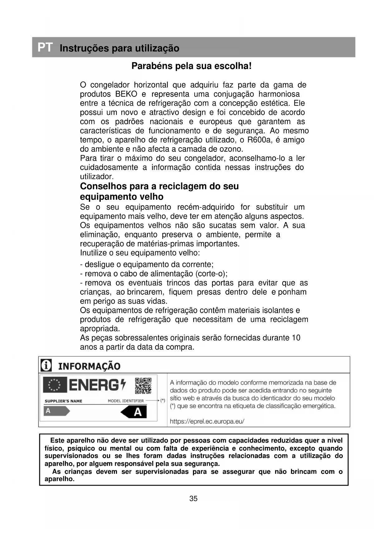 PT Instruções para utilização Este aparelho não deve ser utilizado por pessoas com capacidades reduzidas quer a nivel físico, psíquico ou mental ou com falta de experiência e conhecimento, excepto quando supervisionados ou se lhes foram dadas instruções relacionadas com a utilização do aparelho, por alguem responsável pela sua segurança. As crianças devem ser supervisionadas para se assegurar que não brincam com o aparelho.Avisos e conselhos gerais Não ligue o equipamento se notou alguma avaria. As reparações devem ser feitas apenas por pessoal qualificado. Nas seguintes situações, por favor, desligue o equipamento da tomada: - quando descongelar completamente o equipamento; - quando limpar o equipamento. Para desligar o equipamento, puxe pela ficha e não pelo cabo! Assegure o espaço mínimo entre o equipamento e a parede contra a qual ele está colocado. Não suba em cima do equipamento. Não permita que as crianças brinquem ou entrem dentro do equipamento. Nunca utilize aparelhos eléctricos dentro do congelador para a descongelação. Não use o equipamento próximo de aparelhos de aquecimento, fogões ou outras fontes de calor e fogo. Não deixe a porta do congelador aberta por mais tempo que o necessário quando for colocar ou tirar alimentos. Não deixe alimentos dentro do equipamento se ele não estiver a funcionar. Não coloque dentro dele produtos que contenham gases inflamáveis ou explosivos. Não coloque no congelador bebidas gaseificadas (sumo, água com gás, champanhe, etc.) a garrafa pode explodir! Não congele bebidas em garrafas plásticas. Não consuma cubos de gelo ou gelados imediatamente após tê-los retirado do congelador, porque podem causar "queimaduras de frio”. Nunca toque nas partes metálicas frias ou nos alimentos congelados com as mãos molhadas; as suas mãos podem congelar-se rapidamente nas superfícies muito frias. Para a protecção do equipamento durante o armazenamento e o transporte, o mesmo é fornecido com espaçadores entre a porta e o compartimento (no lado frontal e posterior). Esses espaçadores deverão ser removidos antes de ligar o equipamento. Reciclagem da Embalagem AVISO! Não permita que as crianças brinquem com a embalagem nem com partes dela. Há risco de asfixia com as partes de cartão ondulado e de película plástica. Para chegar até si em boas condições, o equipamento foi protegido com uma embalagem adequada. Todos os materiais da embalagem são compatíveis com o meio ambiente e recicláveis. Por favor, ajude-nos a reciclar a embalagem para a protecção do meio ambiente! IMPORTANTE! Antes de colocar o equipamento a funcionar, leia total e cuidadosamente estas instruções. Elas contêm informações importantes referentes à instalação, utilização e manutenção do equipamento. O fabricante está isento de qualquer responsabilidade se as informações contidas nesse documento não forem observadas. Guarde as instruções num local seguro e de fácil acesso para o caso de necessitar delas. Elas também podem ser úteis para o próximo utilizador, se houver. ATENÇÃO! Este equipamento só deve ser utilizado para o fim a que se destina (uso doméstico), em locais apropriadas, longe da chuva, humidade ou outras condições climáticas. Instruções de transporte O equipamento deve ser transportado, tanto quanto possível, apenas na posição vertical. A embalagem deve estar em perfeitas condições durante o transporte. Se durante o transporte o equipamento for colocado na posição horizontal (apenas de acordo com as marcas na embalagem), é aconselhável que, antes de ser posto a funcionar, seja deixado em repouso por 4 horas para permitir a estabilização do circuito de refrigeração. A não observância dessas instruções pode causar a avaria do motor compressor e a anulação da sua garantia.