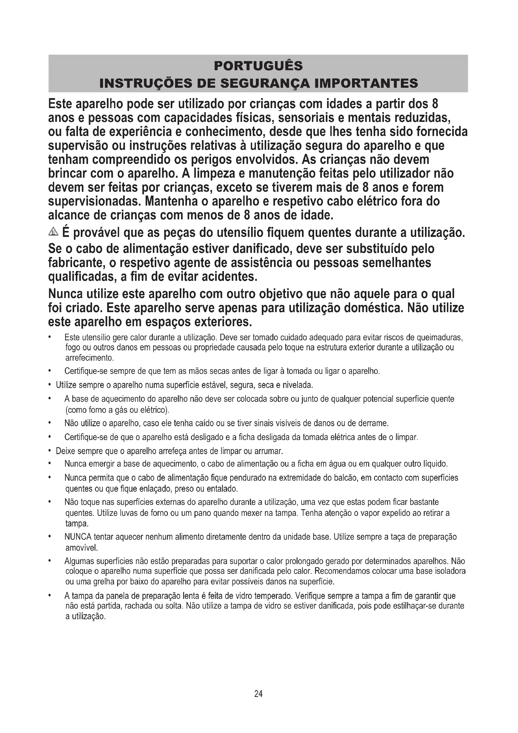 Este aparelho pode ser utilizado por crianças com idades a partir dos 8 anos e pessoas com capacidades físicas, sensoriais e mentais reduzidas, ou falta de experiência e conhecimento, desde que lhes tenha sido fornecida supervisão ou instruções relativas à utilização segura do aparelho e que tenham compreendido os perigos envolvidos. As crianças não devem brincar com o aparelho. A limpeza e manutenção feitas pelo utilizador não devem ser feitas por crianças, exceto se tiverem mais de 8 anos e forem supervisionadas. Mantenha o aparelho e respetivo cabo elétrico fora do alcance de crianças com menos de 8 anos de idade. É provável que as peças do utensílio fiquem quentes durante a utilização. Se o cabo de alimentação estiver danificado, deve ser substituído pelo fabricante, o respetivo agente de assistência ou pessoas semelhantes qualificadas, a fim de evitar acidentes. Nunca utilize este aparelho com outro objetivo que não aquele para o qual foi criado. Este aparelho serve apenas para utilização doméstica. Não utilize este aparelho em espaços exteriores.