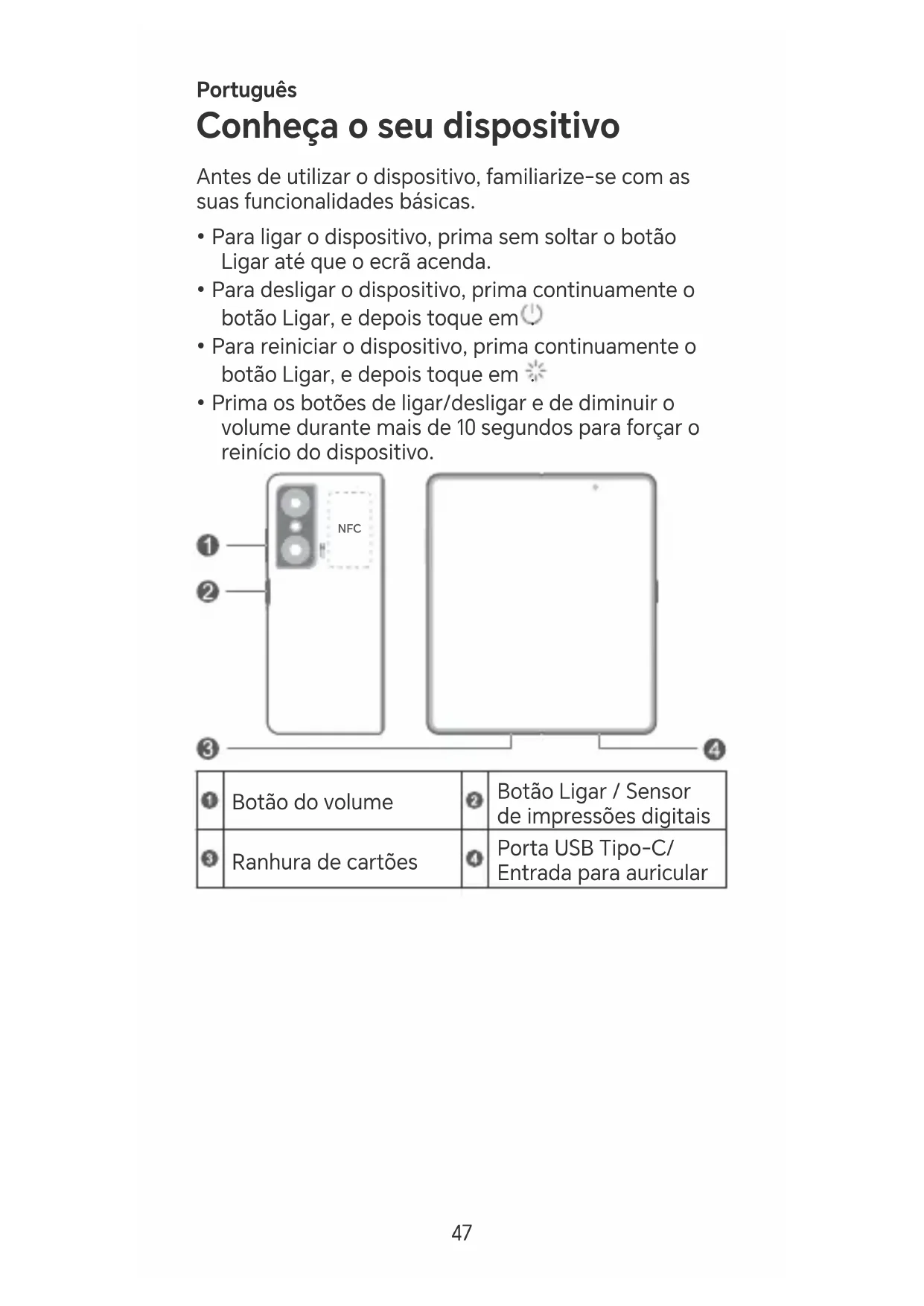 Botão do volume Botão Ligar / Sensor de impressões digitais Ranhura de caões Poa USB Tipo-C/ Entrada para auricular 47• Mantenha a área NFC peo de outros dispositivos ou objetos ao utilizar a função NFC.