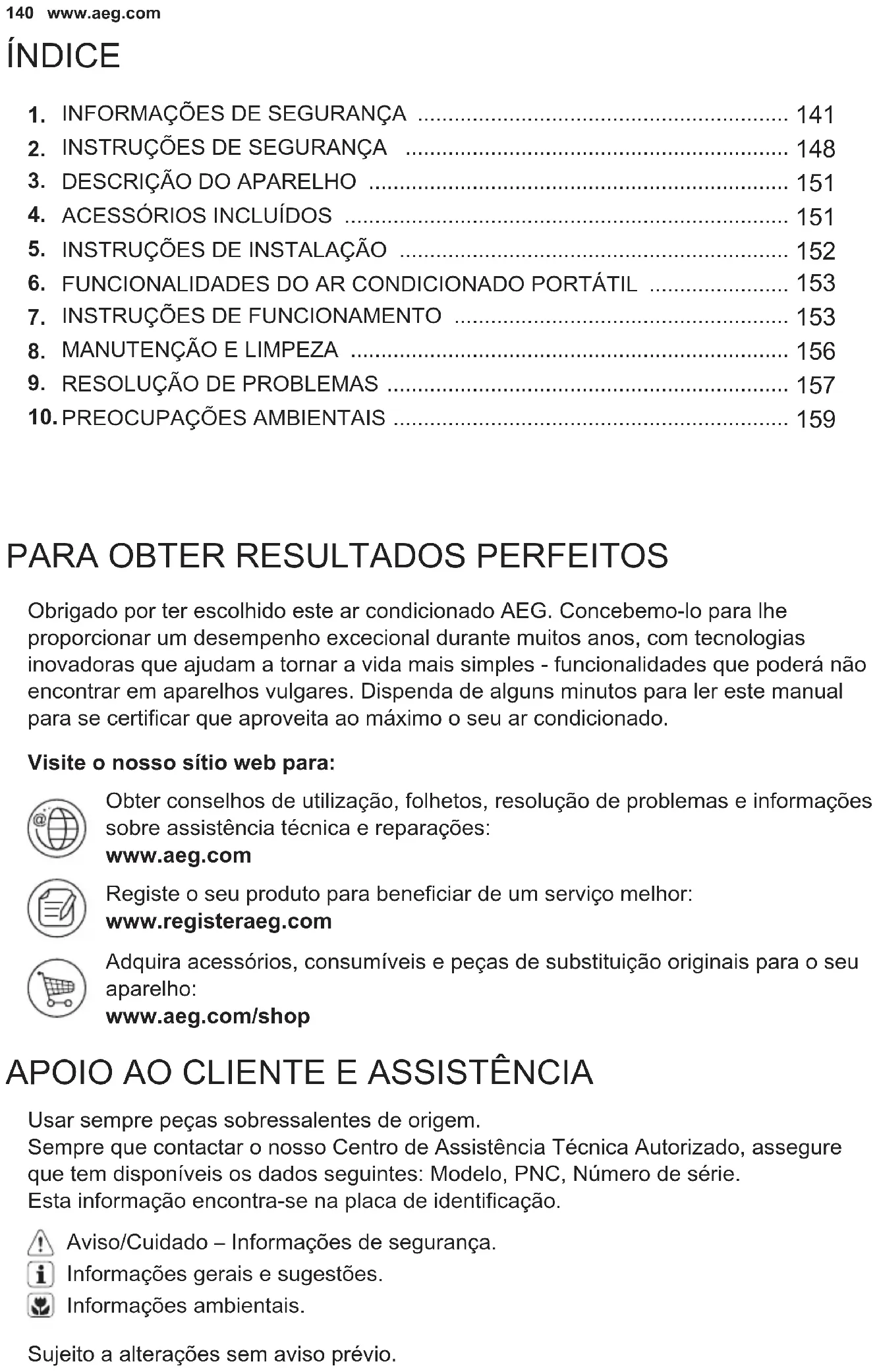 Obrigado por ter escolhido este ar condicionado AEG. Concebemo-lo para lhe proporcionar um desempenho excecional durante muitos anos, com tecnologias inovadoras que ajudam a tornar a vida mais simples - funcionalidades que poderá não encontrar em aparelhos vulgares. Dispenda de alguns minutos para ler este manual para se certificar que aproveita ao máximo o seu ar condicionado. Usar sempre peças sobressalentes de origem. Sempre que contactar o nosso Centro de Assistência Técnica Autorizado, assegure que tem disponíveis os dados seguintes: Modelo, PNC, Número de série. Esta informação encontra-se na placa de identificação. Visite o nosso sítio web para: Obter conselhos de utilização, folhetos, resolução de problemas e informações sobre assistência técnica e reparações: www.aeg.com Registe o seu produto para beneficiar de um serviço melhor: www.registeraeg.com Adquira acessórios, consumíveis e peças de substituição originais para o seu aparelho: www.aeg.com/shop