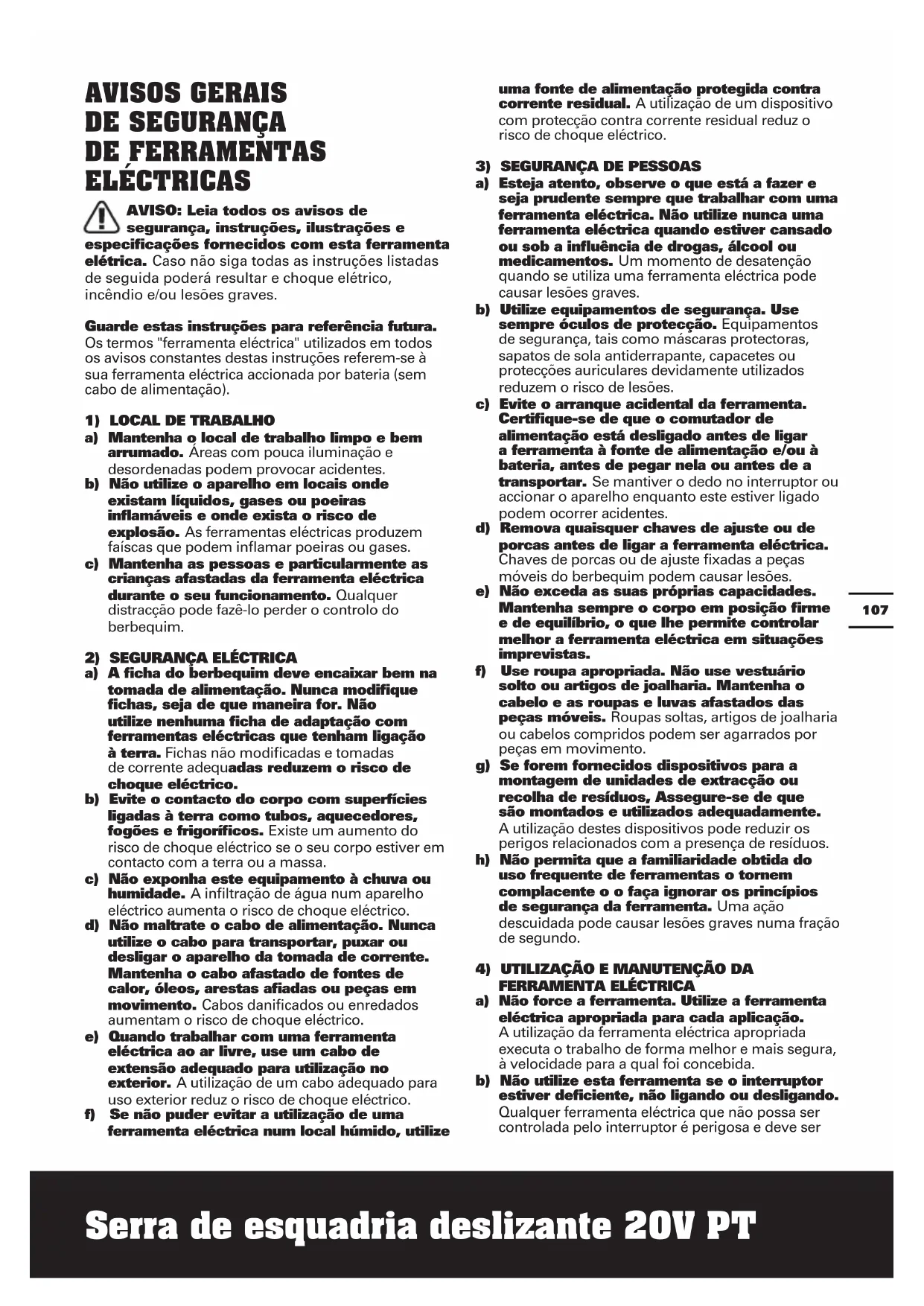 AVISO: Leia todos os avisos e instruções de segurança. A não observância destas instruções pode causar lesões graves. Preserve todos avisos e instruções para referência futura. Este tipo de laser normalmente não apresenta riscos ópticos, embora colocar o raio na direcção dos olhos pode causar cegueira. Não olhe directamente para o raio laser. Pode haver risco caso se olhe deliberadamente na direcção do raio, então favor observar todas as regras de110 Serra de esquadria deslizante 20V PT segurança que se seguem: