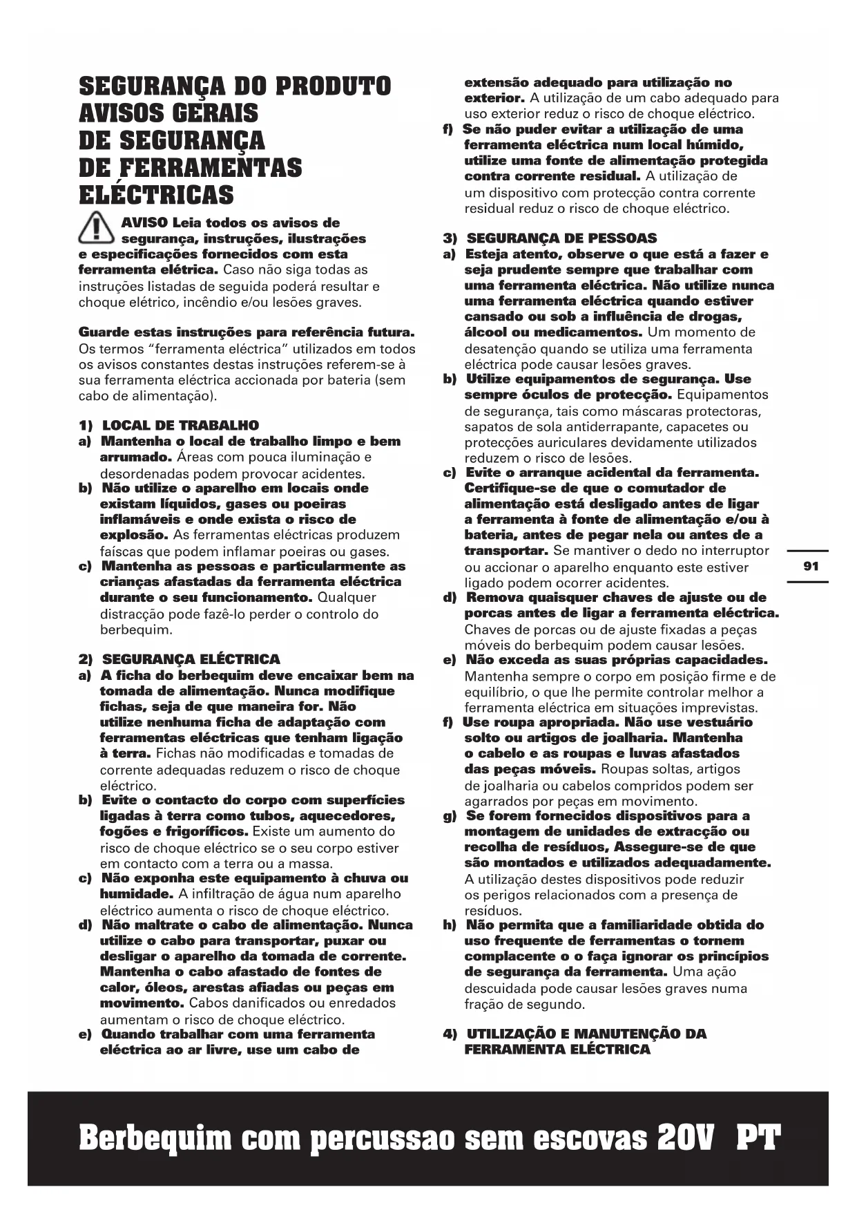 Berbequim com percussao sem escovas 20V a) Não force a ferramenta. Utilize a ferramenta eléctrica apropriada para cada aplicação. A utilização da ferramenta eléctrica apropriada executa o trabalho de forma melhor e mais segura, à velocidade para a qual foi concebida. b) Não utilize esta ferramenta se o interruptor estiver deficiente, não ligando ou desligando. Qualquer ferramenta eléctrica que não possa ser controlada pelo interruptor é perigosa e deve ser reparada. c) Desligue a ficha da tomada elétrica e/ ou remova o conjunto de pilhas, caso seja possível removê-lo, da ferramenta elétrica antes de realizar quaisquer ajustes, substituir acessórios ou armazenar ferramentas elétricas. Estas medidas de segurança preventivas reduzem o risco de activação acidental da ferramenta. d) Quando não estiver a usar a ferramenta eléctrica, guarde-a fora do alcance das crianças e não deixe que esta seja utilizada por pessoas que não a conheçam, nem tenham lido as instruções. As ferramentas eléctricas são perigosas nas mãos de utilizadores inexperientes. e) Realize a manutenção de ferramentas elétricas e acessórios. Verifique quaisquer desalinhamentos, encaixes de peças móveis, quebras e outras condições que possam afectar o funcionamento. Se esta ferramenta estiver avariada, mande-a reparar antes a utilizar. Muitos acidentes são causados pela manutenção deficiente de ferramentas eléctricas. f) Mantenha as ferramentas de corte limpas e afiadas. As ferramentas de corte com manutenção adequada e arestas de corte afiadas têm menos probabilidades bloquear e são mais fáceis de controlar. g) Utilize a ferramenta eléctrica, acessórios, brocas, etc. em conformidade com estas instruções e da forma prevista para este tipo específico de ferramenta, tendo em conta as condições presentes e o trabalho a executar. A utilização de ferramentas eléctricas para aplicações diferentes daquelas a que se destinam pode levar a situações de perigo. h) Mantenha as pegas e as superfícies de aderência secas, limpas e sem óleo e massa lubrificante. As pegas e superfícies de aderência escorregadias não permitem o manuseamento e controlo seguros da ferramenta em situações inesperadas.