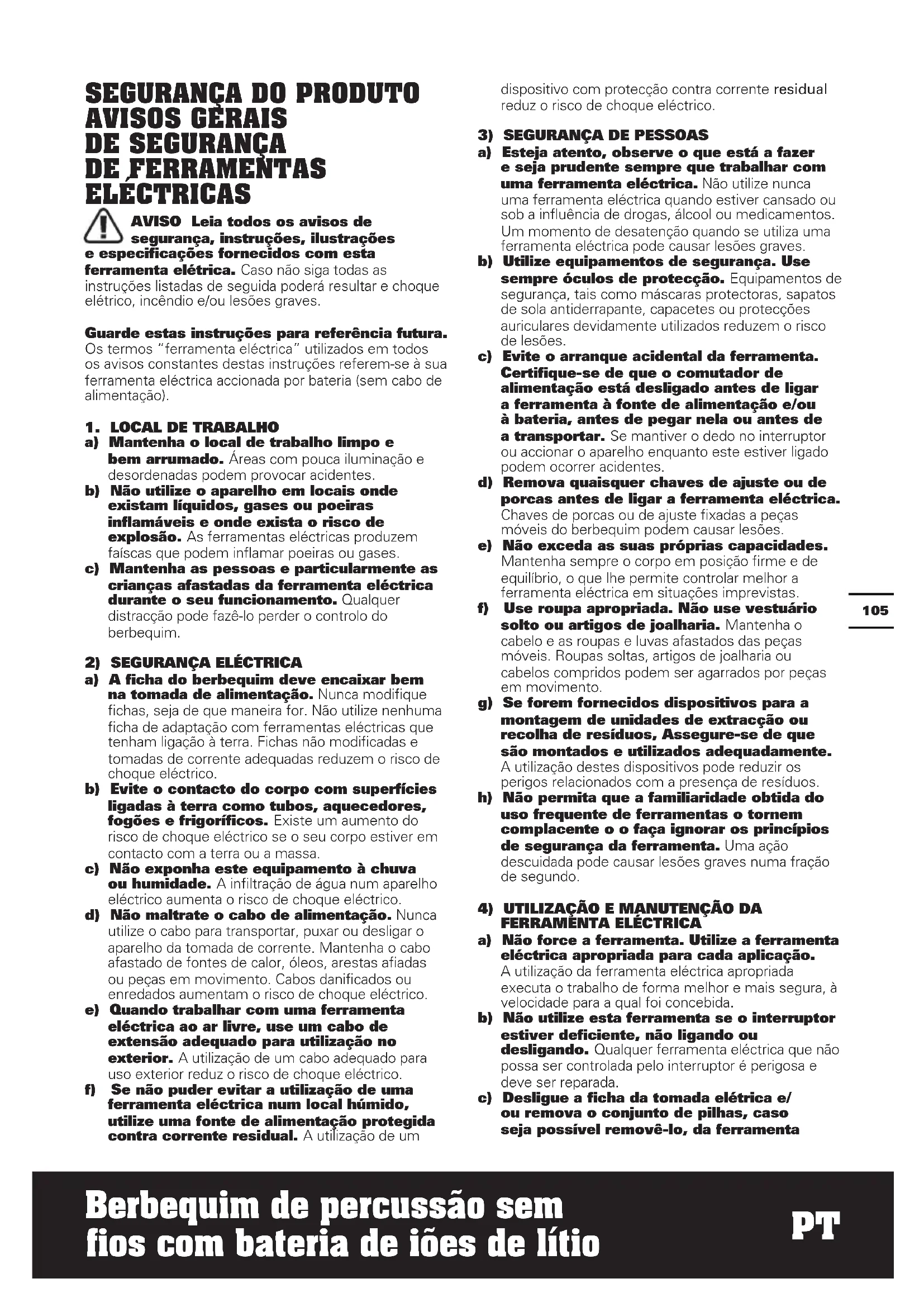 a) Não force a ferramenta. Utilize a ferramenta eléctrica apropriada para cada aplicação. A utilização da ferramenta eléctrica apropriada executa o trabalho de forma melhor e mais segura, à velocidade para a qual foi concebida. b) Não utilize esta ferramenta se o interruptor estiver deficiente, não ligando ou desligando. Qualquer ferramenta eléctrica que não possa ser controlada pelo interruptor é perigosa e deve ser reparada. c) Desligue a ficha da tomada elétrica e/ ou remova o conjunto de pilhas, caso seja possível removê-lo, da ferramenta106 Berbequim de percussão sem fios com bateria de iões de lítio