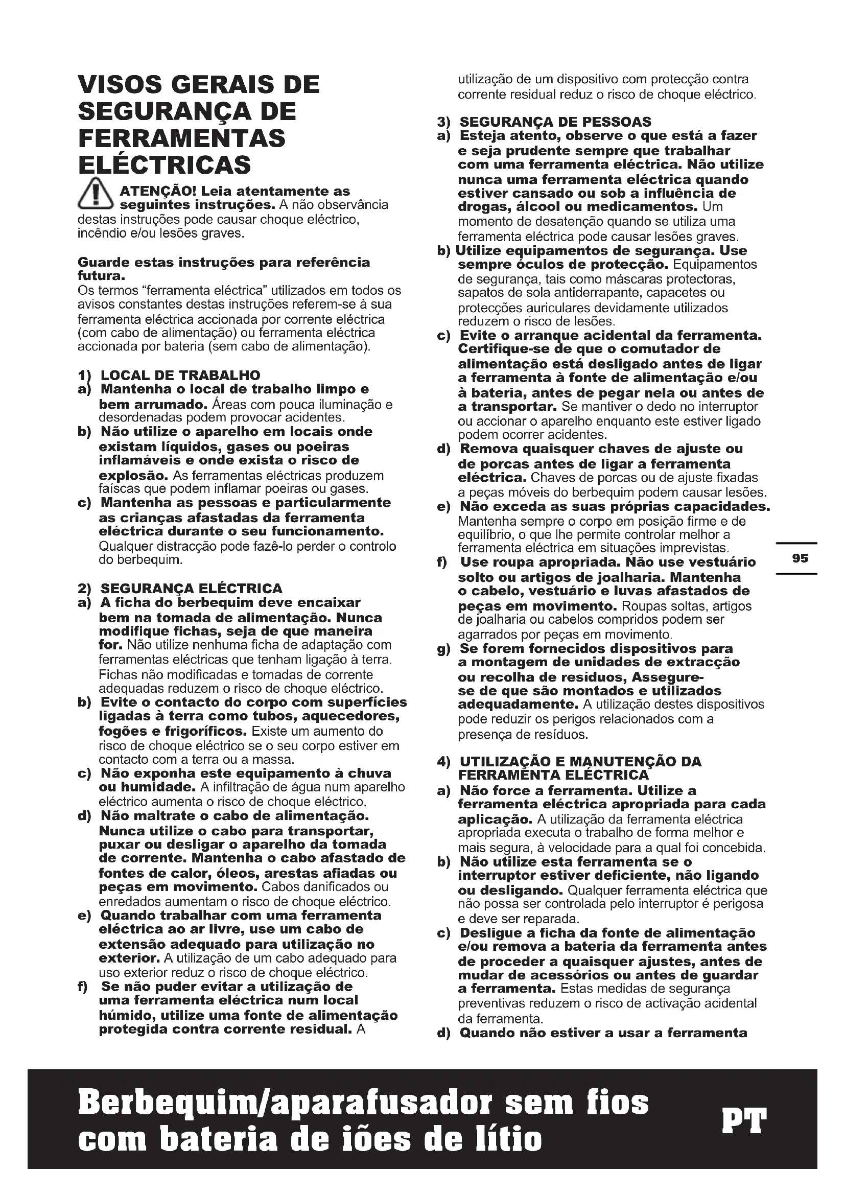 FERRAMENTAS ELÉCTRICAS ATENÇÃO! Leia atentamente as seguintes instruções. A não observância destas instruções pode causar choque eléctrico, incêndio e/ou lesões graves. Guarde estas instruções para referência futura. Os termos “ferramenta eléctrica” utilizados em todos os avisos constantes destas instruções referem-se à sua ferramenta eléctrica accionada por corrente eléctrica (com cabo de alimentação) ou ferramenta eléctrica accionada por bateria (sem cabo de alimentação).