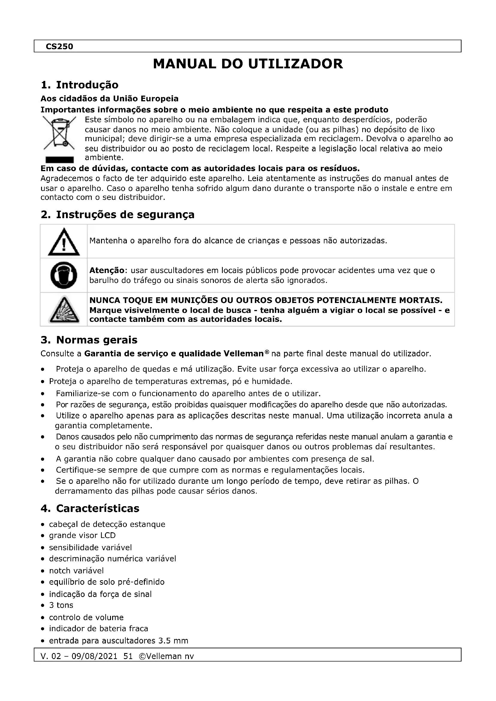 Utilize este aparelho apenas com acessórios originais. A Velleman NV não será responsável por quaisquer danos ou lesões causados pelo uso (indevido) do aparelho. Para mais informação sobre este produto e para aceder à versão mais recente deste manual do utilizador, visite a nossa página www.velleman.eu. Podem alterar-se as especificações e o conteúdo deste manual sem aviso prévio. Declaração de conformidade RED A Velleman NV declara que o tipo de equipamento de rádio [CS250] está em conformidade com a Diretiva 2014/53/EU. O texto completo da declaração UE de conformidade está disponível no seguinte endereço: www.velleman.eu.