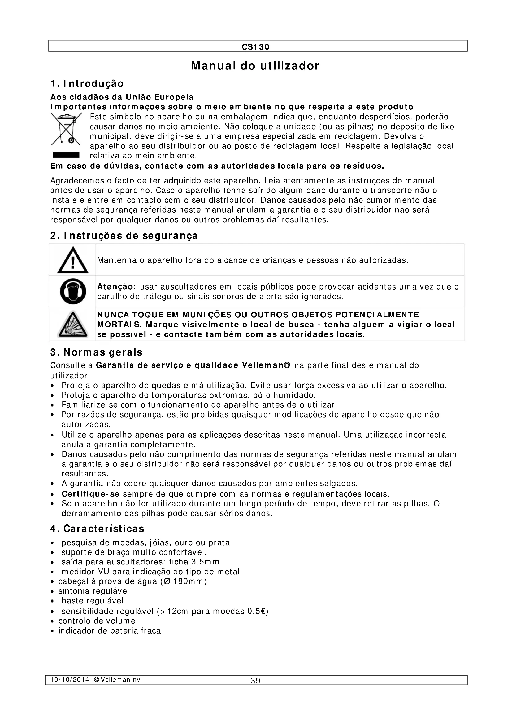 - Seja muito cuidadoso no caso de encontrar alguma munição ou qualquer objeto letal tal como um mina ainda intacta. Não toque no objeto! Marque o local cuidadosamente e informe a polícia local sobre a descoberta.CS130 10/10/2014 © Velleman nv