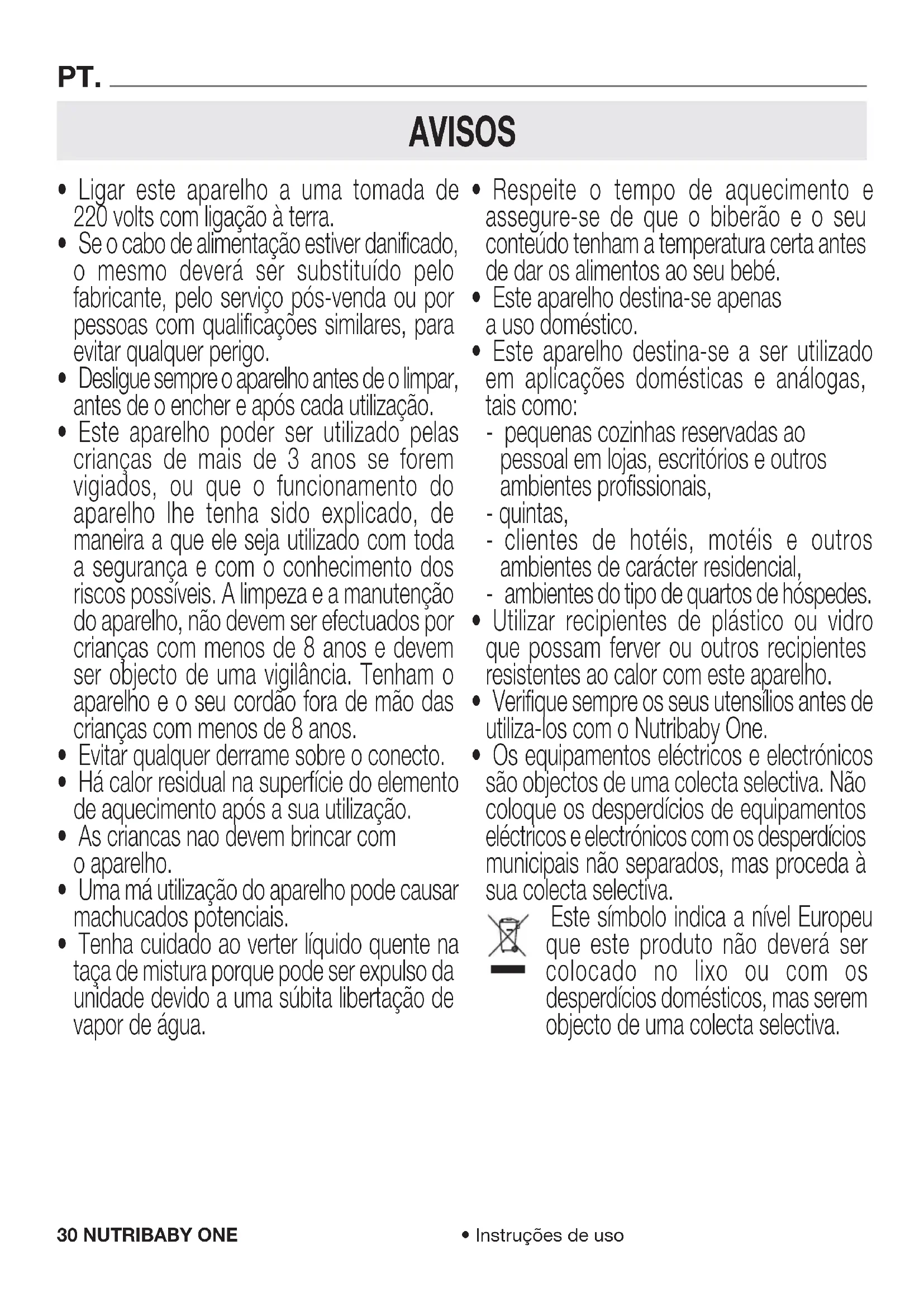 - Os equipamentos eléctricos e electrónicos são objectos de uma colecta selectiva. Não coloque os desperdícios de equipamentos eléctricos e electrónicos com os desperdícios municipais não separados, mas proceda à sua colecta selectiva. Este símbolo indica a nível Europeu que este produto não deverá ser colocado no lixo ou com os desperdícios domésticos, mas serem objecto de uma colecta selectiva.31NUTRIBABY ONE