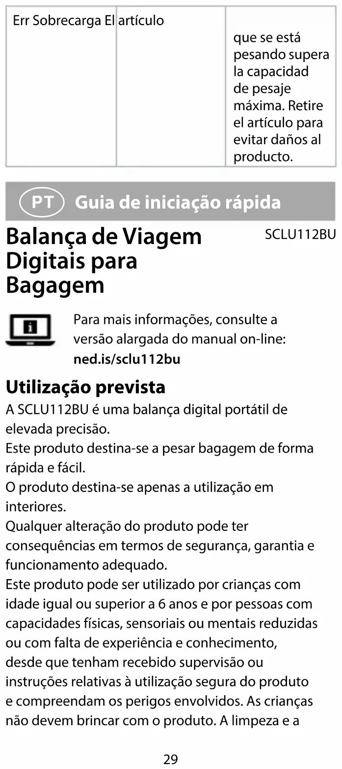 Guia de iniciação rápida Balança de Viagem Digitais para Bagagem SCLU112BU Para mais informações, consulte a versão alargada do manual on-line: ned.is/sclu112bu Utilização prevista A SCLU112BU é uma balança digital portátil de elevada precisão. Este produto destina-se a pesar bagagem de forma rápida e fácil. O produto destina-se apenas a utilização em interiores. Qualquer alteração do produto pode ter consequências em termos de segurança, garantia e funcionamento adequado. Este produto pode ser utilizado por crianças com idade igual ou superior a 6 anos e por pessoas com capacidades físicas, sensoriais ou mentais reduzidas ou com falta de experiência e conhecimento, desde que tenham recebido supervisão ou instruções relativas à utilização segura do produto e compreendam os perigos envolvidos. As crianças não devem brincar com o produto. A limpeza e a30 manutenção destinadas ao utilizador não devem ser efetuadas por crianças sem vigilância. Peças principais (imagem A) 1 Ecrã 2 Anel triangular 3 Botão de alimentação e Z/T 4 Botão de unidade de medição 5 Cinta 6 Gancho 7 Bateria 8 Compartimento das pilhas 9 Tampa das pilhas Instruções de segurança