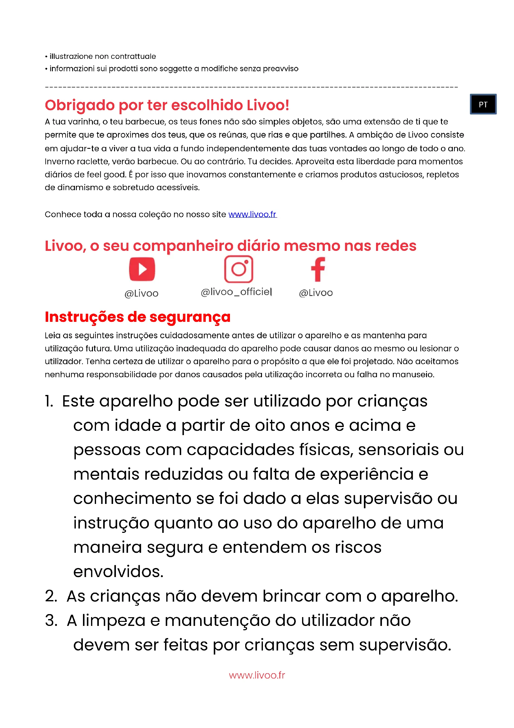 Obrigado por ter escolhido Livoo! A tua varinha, o teu barbecue, os teus fones não são simples objetos, são uma extensão de ti que te permite que te aproximes dos teus, que os reúnas, que rias e que partilhes. A ambição de Livoo consiste em ajudar-te a viver a tua vida a fundo independentemente das tuas vontades ao longo de todo o ano. Inverno raclette, verão barbecue. Ou ao contrário. Tu decides. Aproveita esta liberdade para momentos diários de feel good. É por isso que inovamos constantemente e criamos produtos astuciosos, repletos de dinamismo e sobretudo acessíveis. Conhece toda a nossa coleção no nosso site www.livoo.fr Livoo, o seu companheiro diário mesmo nas redes