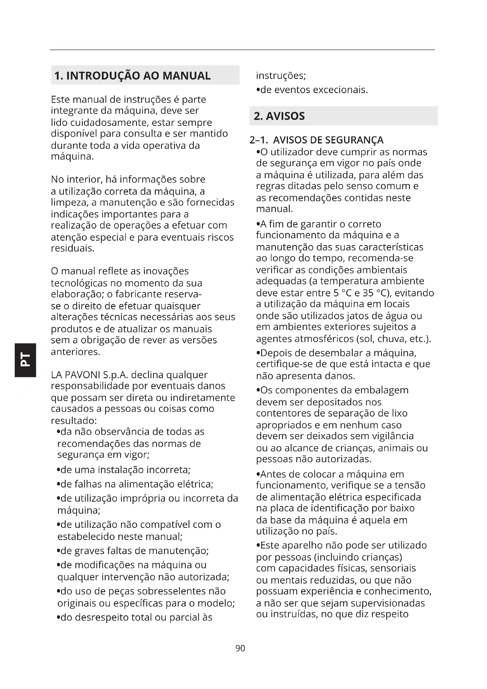 Este manual de instruções é parte integrante da máquina, deve ser lido cuidadosamente, estar sempre disponível para consulta e ser mantido durante toda a vida operativa da máquina. No interior, há informações sobre a utilização correta da máquina, a limpeza, a manutenção e são fornecidas indicações importantes para a realização de operações a efetuar com atenção especial e para eventuais riscos residuais. O manual reete as inovações tecnológicas no momento da sua elaboração; o fabricante reserva- se o direito de efetuar quaisquer alterações técnicas necessárias aos seus produtos e de atualizar os manuais sem a obrigação de rever as versões anteriores. LA PAVONI S.p.A. declina qualquer responsabilidade por eventuais danos que possam ser direta ou indiretamente causados a pessoas ou coisas como resultado: