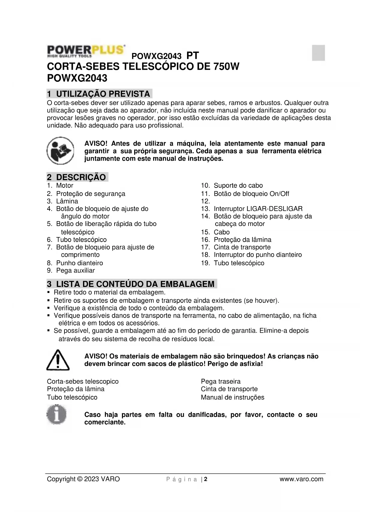 - Nunca deve utilizar o corta-sebes sem primeiro verificar o aperto do suporte。POWXG2043 PT Copyright © 2023 VARO P á g i n a | 8 www.varo.com