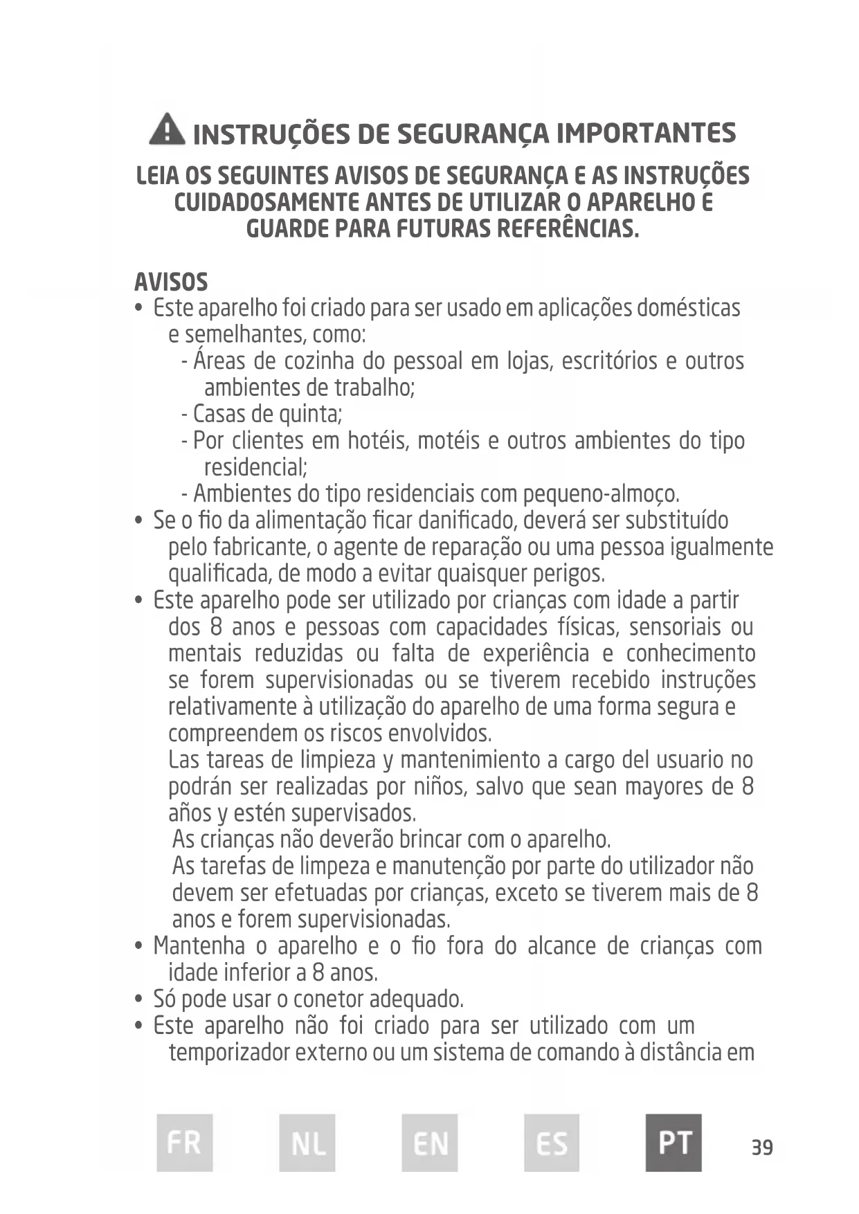 - Este aparelho pode ser utilizado por crianças com idade a partir dos 8 anos e pessoas com capacidades físicas, sensoriais ou mentais reduzidas ou falta de experiência e conhecimento se forem supervisionadas ou se tiverem recebido instruções relativamente à utilização do aparelho de uma forma segura e compreendem os riscos envolvidos. Las tareas de limpieza y mantenimiento a cargo del usuario no podrán ser realizadas por niños, salvo que sean mayores de 8 años y estén supervisados. As crianças não deverão brincar com o aparelho. As tarefas de limpeza e manutenção por parte do utilizador não devem ser efetuadas por crianças, exceto se tiverem mais de 8 anos e forem supervisionadas.