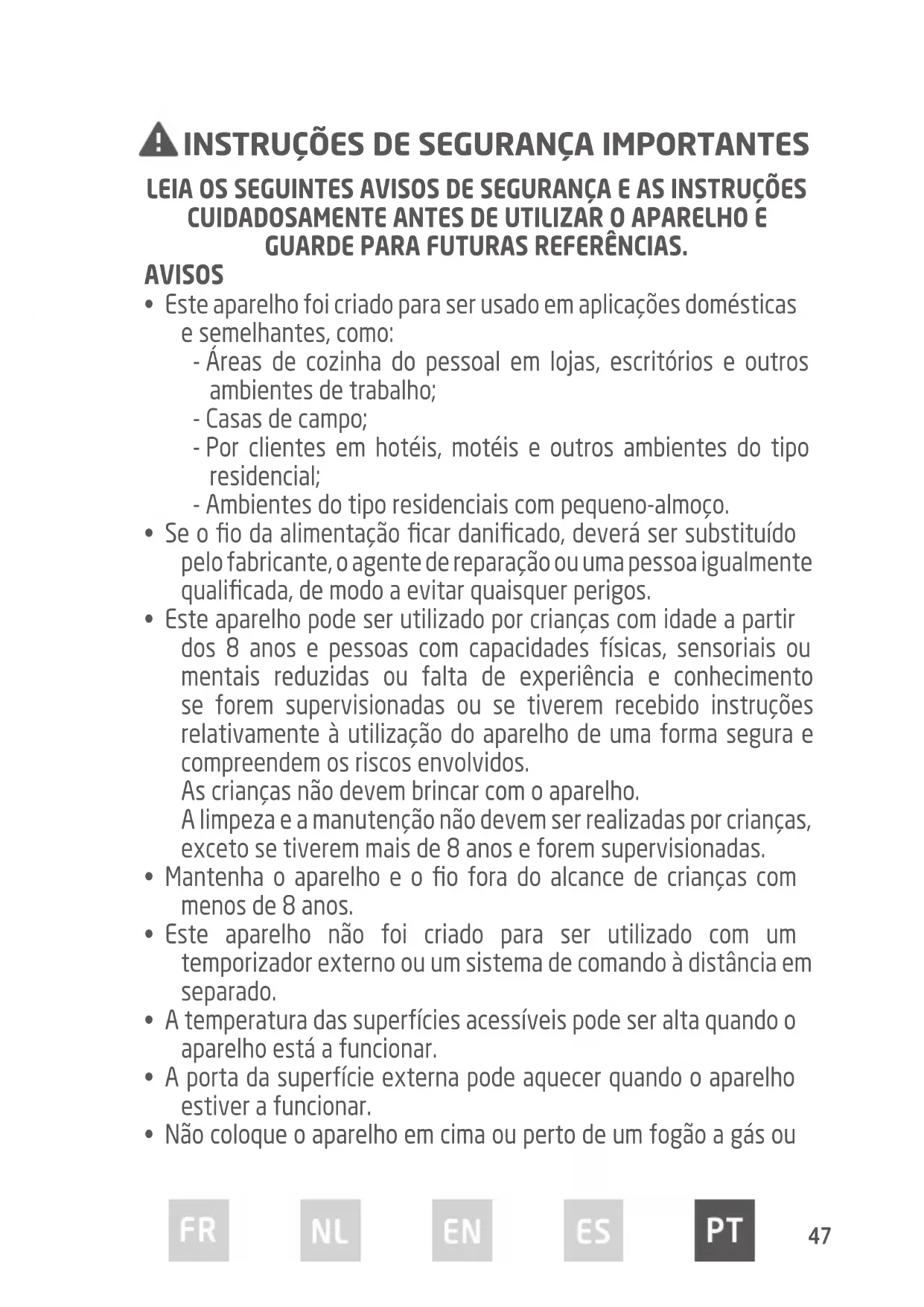 - Este aparelho pode ser utilizado por crianças com idade a partir dos 8 anos e pessoas com capacidades físicas, sensoriais ou mentais reduzidas ou falta de experiência e conhecimento se forem supervisionadas ou se tiverem recebido instruções relativamente à utilização do aparelho de uma forma segura e compreendem os riscos envolvidos. As crianças não devem brincar com o aparelho. A limpeza e a manutenção não devem ser realizadas por crianças, exceto se tiverem mais de 8 anos e forem supervisionadas.