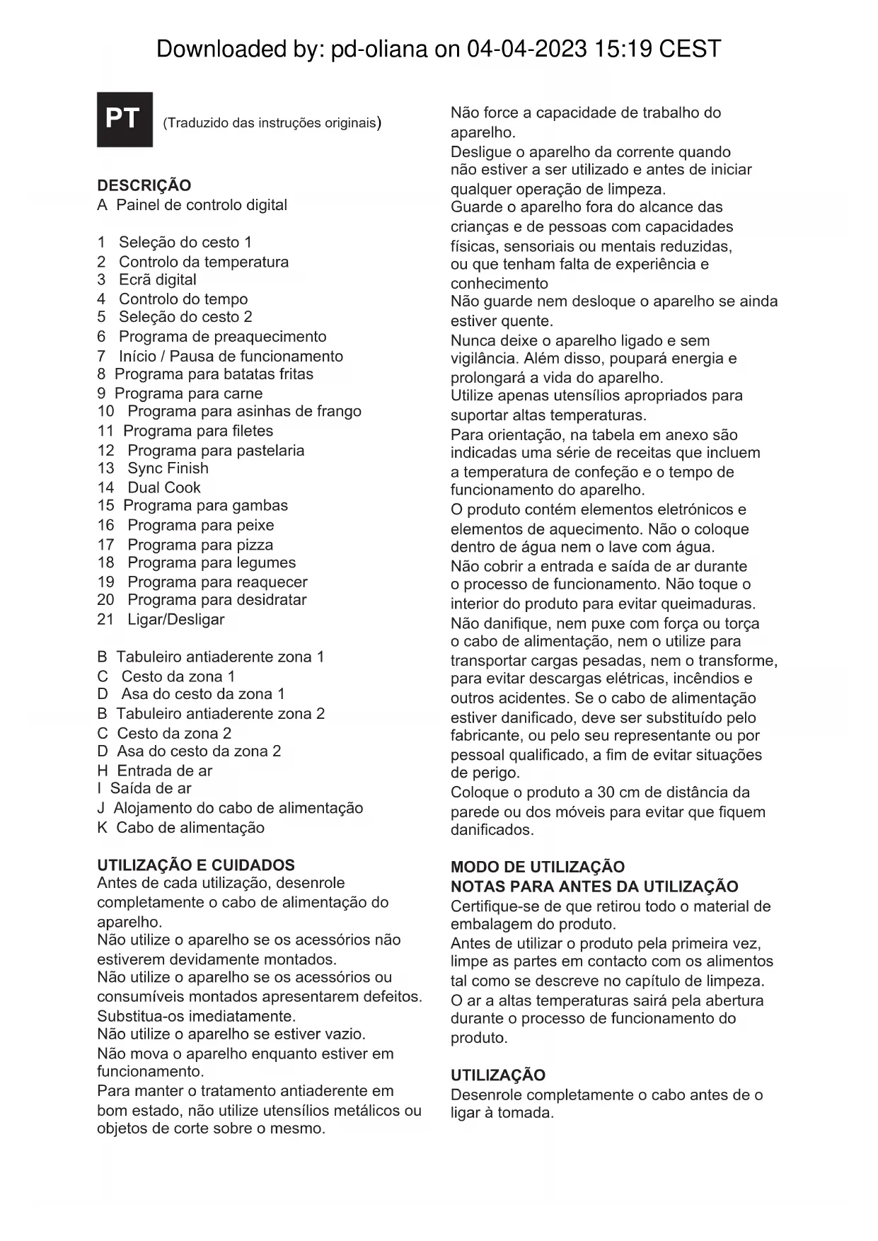 O AIR FRYER não funciona. O aparelho não está ligado à corrente elétrica. Ligue o aparelho a uma tomada com ligação à terra. O temporizador não está congurado. Para ligar o aparelho, gire o temporizador até obter o tempo de preparação requerido. Os alimentos fritos não estão bem cozinhados A quantidade de alimentos colocada no cesto é excessiva. Coloque uma menor quantidade de ingredientes no cesto. Quantidades mais pequenas podem ser melhor agitadas e fritam mais uniformemente. A temperatura selecionada é demasiado baixa. Aumente a temperatura até chegar à posição adequada. Ajuste da temperatura: consulte o guia de confeção. Os alimentos estão fritos de maneira desigual. Certos ingredientes devem ser agitados a meio do tempo de preparação. Quando os alimentos se encontram uns em cima dos outros (por exemplo, batatas fritas) têm de ser agitados a meio do tempo de preparação. Os fritos não cam crocantes. O tipo alimento utilizado é incorreto. Consulte o modo de preparação dos alimentos na embalagem do fabricante. Cesto sobrecarregado. Não encha o cesto acima da indicação de MAX. Não se consegue deslizar a cuba/cesto no aparelho. O cesto não está colocado corretamente na fritadeira. Empurre o cesto para dentro da fritadeira até ouvir um clique Sai fumo branco do aparelho. Estão a ser preparados ingredientes com alto conteúdo em gordura. Adicionou-se óleo na preparação. Não utilize alimentos com alto conteúdo em gordura nem adicione mais óleo do que o estritamente necessário. Esta fritadeira utiliza uma tecnologia que requer pouco ou nenhum óleo. A fritadeira ainda contém resíduos de gordura da utilização anterior. O fumo branco é provocado pela gordura aquecida na cuba. Downloaded by: pd-oliana on 04-04-2023 15:19 CESTIT (Tradotto dal manuale di istruzioni originale) DESCRIZIONE A Pannello di controllo digitale 1 Selezione cestello 1 2 Controllo della temperatura 3 Schermo digitale 4 Controllo del tempo 5 Selezione cestello 2 6 Programma per preriscaldare 7 Avvio / Pausa di cottura 8 Programma per patate fritte 9 Programma per carne 10 Programma per ali di pollo 11 Programma per bistecca 12 Programma per dolci 13 Sync Finish 14 Dual cook 15 Programma per gamberi 16 Programma per pesce 17 Programma per pizza 18 Programma per verdure 19 Programma per riscaldare 20 Programma per disidratare 21 Acceso/Spento B Vassoio antiaderente zona 1 C Cestello della zona 1 D Manico del cestello della zona 1 E Vassoio antiaderente zona 2 F Cestello zona 2 G Manico del cestello della zona 2 H Ingresso dell’aria I Uscita dell’aria J Alloggiamento del cavo di alimentazione K Cavo di alimentazione