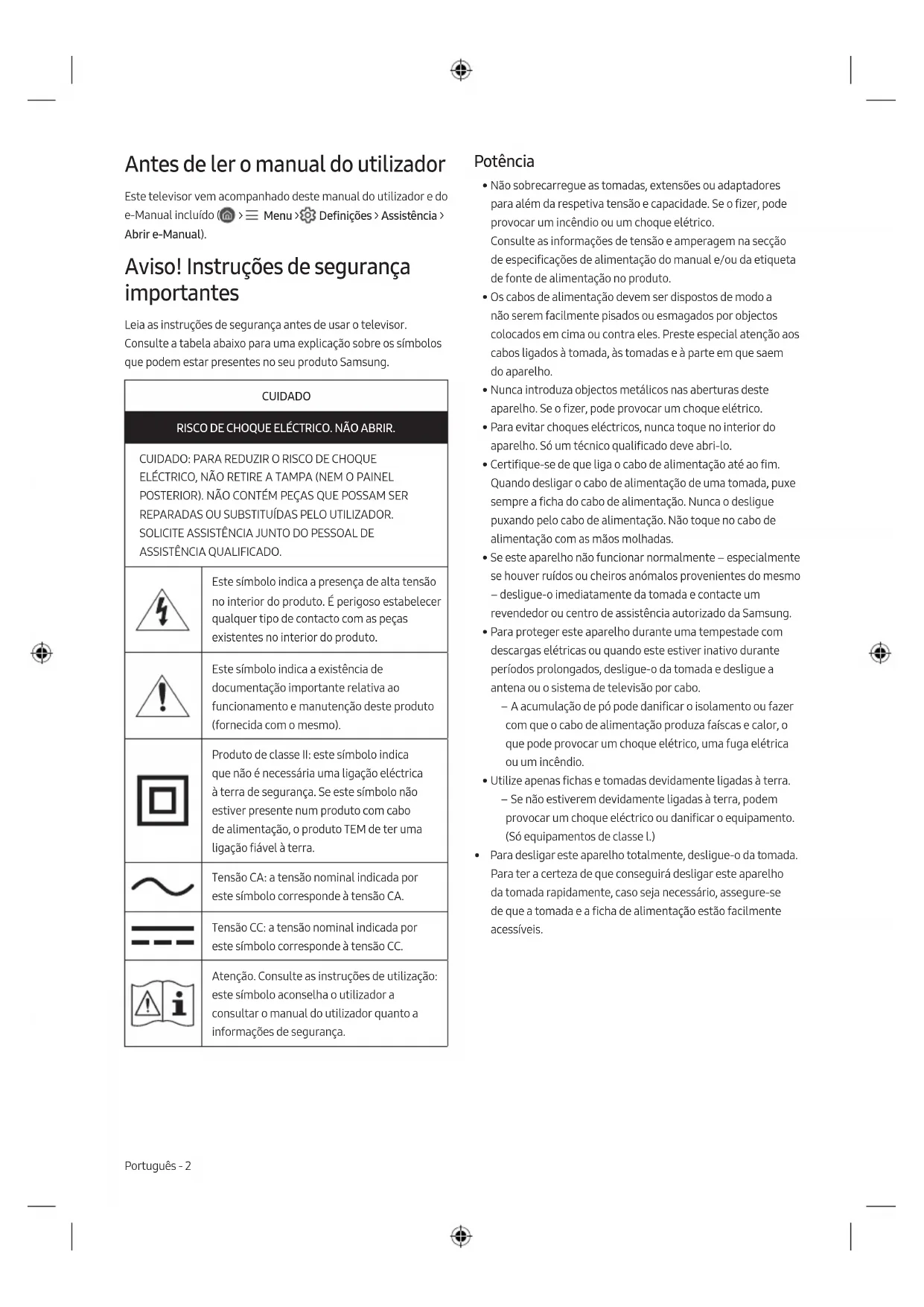 - Para a sua segurança, não tente remover a bateria. Se a bateria não for removida corretamente, poderá danificá- la e ao dispositivo, causar ferimentos em si e/ou tornar o dispositivo pouco seguro. Pelo presente documento, a Samsung declara que este equipamento de rádio está em conformidade com a Diretiva 2014/53/UE e com os requisitos estatutários relevantes no Reino Unido. O texto completo da declaração de conformidade está disponível no seguinte endereço da Internet: http://www.samsung.com aceda a Suporte e introduza o nome do modelo. Este equipamento pode ser utilizado em todos os países da UE e no Reino Unido. A função WLAN 5 GHz (Wi-Fi) deste equipamento só pode ser utilizada em espaços interiores. Potência máx. do transmissor BT: 100 mW a 2,4 GHz – 2,4835 GHz Potência máx. do transmissor Wi-Fi: 100 mW a 2,4 GHz - 2,4835 GHz, 200 mW a 5,15 GHz - 5,25 GHz, 100 mW a 5,25 GHz - 5,35 GHz & 5,47 GHz - 5,725 GHz Eliminação Correcta Deste Produto (Resíduos de Equipamentos Eléctricos e Electrónicos) (Aplicável a países cujos sistemas de recolha sejam separados) Esta marca apresentada no produto, nos acessórios ou na literatura – indica que o produto e os seus acessórios electrónicos (por exemplo, o carregador, o auricular, o cabo USB) não deverão ser eliminados juntamente com os resíduos domésticos no final do seu período de vida útil. Para impedir danos ao ambiente ou à saúde humana causados pela eliminação incontrolada de resíduos, deverá separar estes equipamentos de outros tipos de resíduos e reciclá-los de forma responsável, para promover uma reutilização sustentável dos recursos materiais. Os utilizadores domésticos deverão contactar o estabelecimento onde adquiriram este produto ou as entidades oficiais locais para obterem informações sobre onde e de que forma podem entregar estes equipamentos para permitir efectuar uma reciclagem segura em termos ambientais. Os utilizadores profissionais deverão contactar o seu fornecedor e consultar os termos e condições do contrato de compra. Este produto e os seus acessórios electrónicos não deverão ser misturados com outros resíduos comerciais para eliminação. Português - 8Esta página foi deixada em branco intencionalmente.Vor dem Lesen der Bedienungsanleitung Dieser Fernseher wird mit dieser Bedienungsanleitung und einem eingebetteten e-Manual ( > Menü > Einstellungen > Unterstützung > e-Manual öffnen) geliefert. Achtung! Wichtige Sicherheitshinweise Lesen Sie die Sicherheitshinweise sorgfältig, bevor Sie das Fernsehgerät verwenden. In der folgenden Tabelle finden Sie eine Erklärung für die Symbole, die Sie möglicherweise auf Ihrem Samsung-Produkt sehen. ACHTUNG