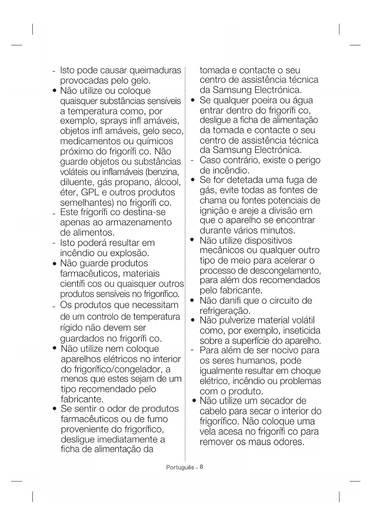 - t - t t -ttipo de meio para acelerar o p rocesso de descongelamento, para além dos recomendados pelo fabricante.Não danifique o circuito de refrigeração. Não coloque a prateleira do frigorífico ao contrário. O batente da prateleira não funcionaria. A queda da prateleira de vidro pode causar ferimentos pessoais .Não coloque a prateleira do frigorífico no lugar da caixa. S e for forçada, a parede interior ou o vidro podem quebrar-se.Is to poderá provocar ferimentos pessoais ou danos materiais. - t -t Na eventualidade de uma fuga de gás (como, por exemplo, propano, GPL, etc.) areje imediatamente sem tocar na fi cha de alimentação. Não toque no aparelho nem no cabo de alimentação. Não utilize uma ventoinha de ventilação.Uma faísca pode resultar numa explosão ou incêndio. Utilize apenas as lâmpadas LED fornecidas pelo fabricante ou agente a utorizado de assistência técnica.As crianças devem ser supervisionadas de modo a assegurar-se de que estas - - t t t não brincam com o aparelho. Mantenha os dedos longe de áreas “em que se possa entalar”; os intervalos entre as portas e o armário do frigorífico são necessariamente pequenos.8 t Isto pode causar queimaduras provocadas pelo gelo.Não utilize ou coloque quaisquer substâncias sensíveis a temperatura como, por exemplo, sprays infl amáveis, objetos infl amáveis, gelo seco, medicamentos ou químicos próximo do frigorífi co. Não guarde objetos ou substâncias voláteis ou inflamáveis (benzina, diluente, gás propano, álcool, éter, GPL e outros produtos semelhantes) no frigorífi co.Este frigorífi co destina-se apenas ao armazenamento de alimentos.Isto poderá resultar em incêndio ou explosão.Não guarde produtos farmacêuticos, materiais científi cos ou quaisquer outros produtos sensíveis no frigorífico Os produtos que necessitam e um controlo de temperatura rígido não devem ser guardados no frigorífi co. - - - t - t t Não utilize nem coloque aparelhos elétricos no interior do frigorífico/congelador, a menos que estes sejam de um tipo recomendado pelo fabricante.Se sentir o odor de produtos farmacêuticos ou de fumo proveniente do frigorífico, desligue imediatamente a fi cha de alimentação da - t t