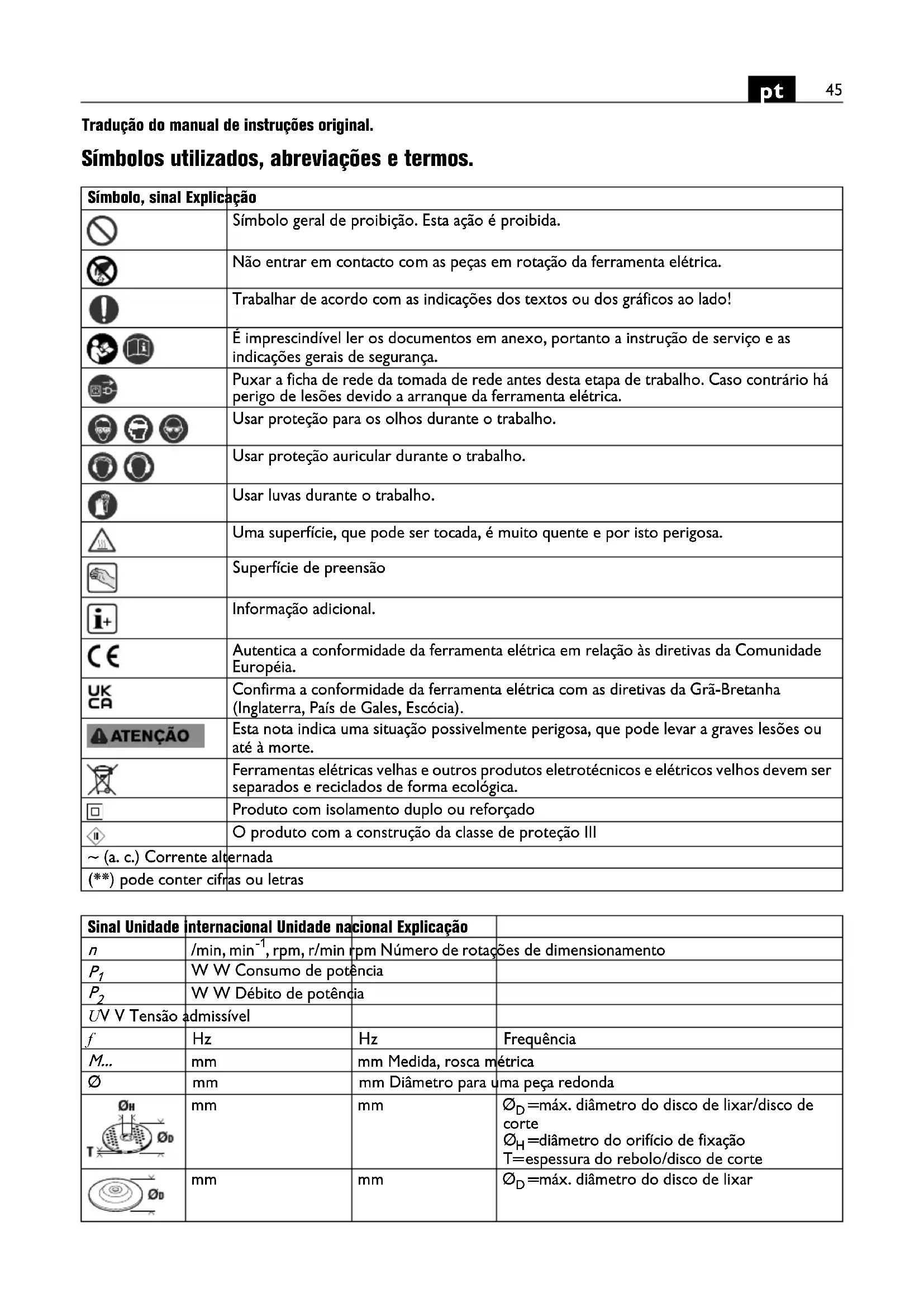 Tradução do manual de instruções original. Símbolos utilizados, abreviações e termos. Símbolo, sinal Explicação Símbolo geral de proibição. Esta ação é proibida. Não entrar em contacto com as peças em rotação da ferramenta elétrica. Trabalhar de acordo com as indicações dos textos ou dos gráficos ao lado! É imprescindível ler os documentos em anexo, portanto a instrução de serviço e as indicações gerais de segurança. Puxar a ficha de rede da tomada de rede antes desta etapa de trabalho. Caso contrário há perigo de lesões devido a arranque da ferramenta elétrica. Usar proteção para os olhos durante o trabalho. Usar proteção auricular durante o trabalho. Usar luvas durante o trabalho. Uma superfície, que pode ser tocada, é muito quente e por isto perigosa. Superfície de preensão Informação adicional. Autentica a conformidade da ferramenta elétrica em relação às diretivas da Comunidade Européia. Confirma a conformidade da ferramenta elétrica com as diretivas da Grã-Bretanha (Inglaterra, País de Gales, Escócia). Esta nota indica uma situação possivelmente perigosa, que pode levar a graves lesões ou até à morte. Ferramentas elétricas velhas e outros produtos eletrotécnicos e elétricos velhos devem ser separados e reciclados de forma ecológica. Produto com isolamento duplo ou reforçado O produto com a construção da classe de proteção III ~ (a. c.) Corrente alternada (**) pode conter cifras ou letras Sinal Unidade internacional Unidade nacional Explicação