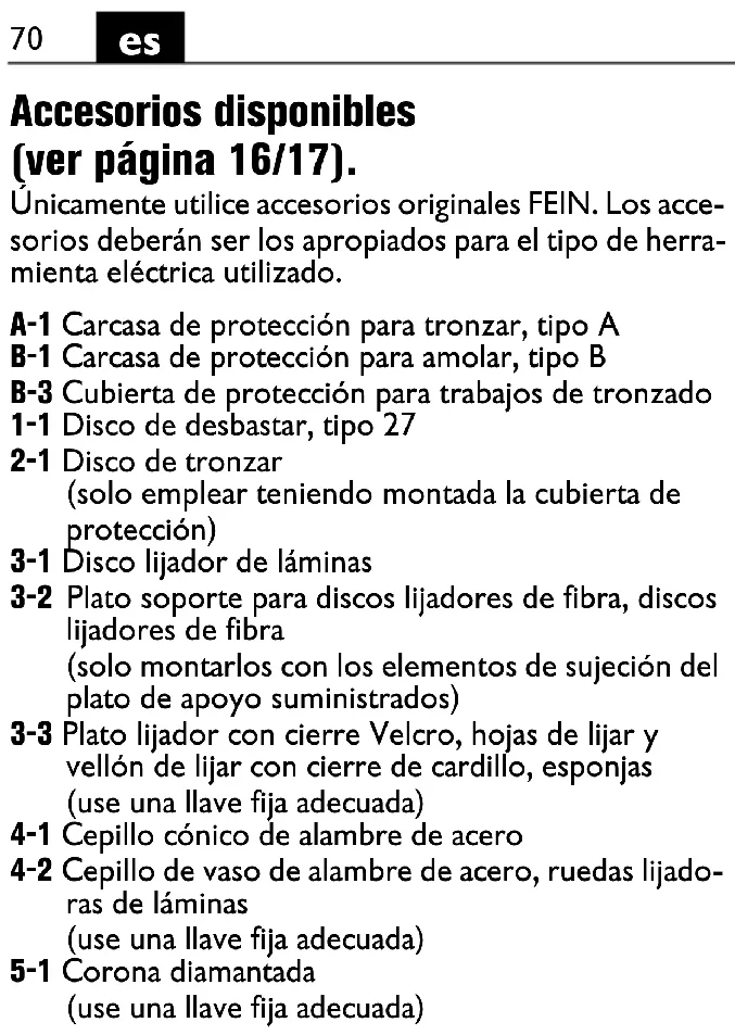 Seleção de acessórios (veja página 16/17). Só utilizar acessórios originais da FEIN. O acessório deve ser destinado para o tipo da ferramenta elétrica. A-1 Cobertura de proteção para corte, tipo A B-1 Cobertura de proteção para esmerilhamento, tipo B B-3 Cobertura de proteção para cortar 1-1 Disco de desbaste, tipo 27 2-1 Disco de corte (usar somente com a cobertura de proteção mon- tada) 3-1 Disco flap 3-2 Placa de apoio para rebolos de fibra, rebolos de fibra (apenas aplicar com o dispositivo de fixação da placa de apoio fornecido) 3-3 Disco de lixar com velcro, folhas de lixa adesivas, lã abrasiva adesiva, esponjas (usar uma chave de forqueta apropriada) 4-1 Escova cônica de arame de aço 4-2 Escova tipo tacho com arame de aço, rodas abrasi- vas lamelares (usar uma chave de forqueta apropriada) 5-1 Cortador de furos diamantado (usar uma chave de forqueta apropriada)80