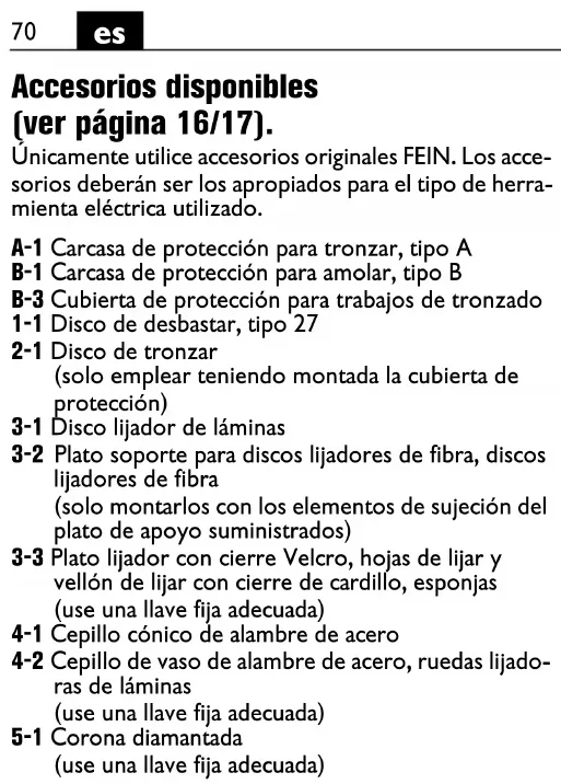 Seleção de acessórios (veja página 16/17). Só utilizar acessórios originais da FEIN. O acessório deve ser destinado para o tipo da ferramenta elétrica. A-1 Cobertura de proteção para corte, tipo A B-1 Cobertura de proteção para esmerilhamento, tipo B B-3 Cobertura de proteção para cortar 1-1 Disco de desbaste, tipo 27 2-1 Disco de corte (usar somente com a cobertura de proteção mon- tada) 3-1 Disco flap 3-2 Placa de apoio para rebolos de fibra, rebolos de fibra (apenas aplicar com o dispositivo de fixação da placa de apoio fornecido) 3-3 Disco de lixar com velcro, folhas de lixa adesivas, lã abrasiva adesiva, esponjas (usar uma chave de forqueta apropriada) 4-1 Escova cônica de arame de aço 4-2 Escova tipo tacho com arame de aço, rodas abrasi- vas lamelares (usar uma chave de forqueta apropriada) 5-1 Cortador de furos diamantado (usar uma chave de forqueta apropriada)80