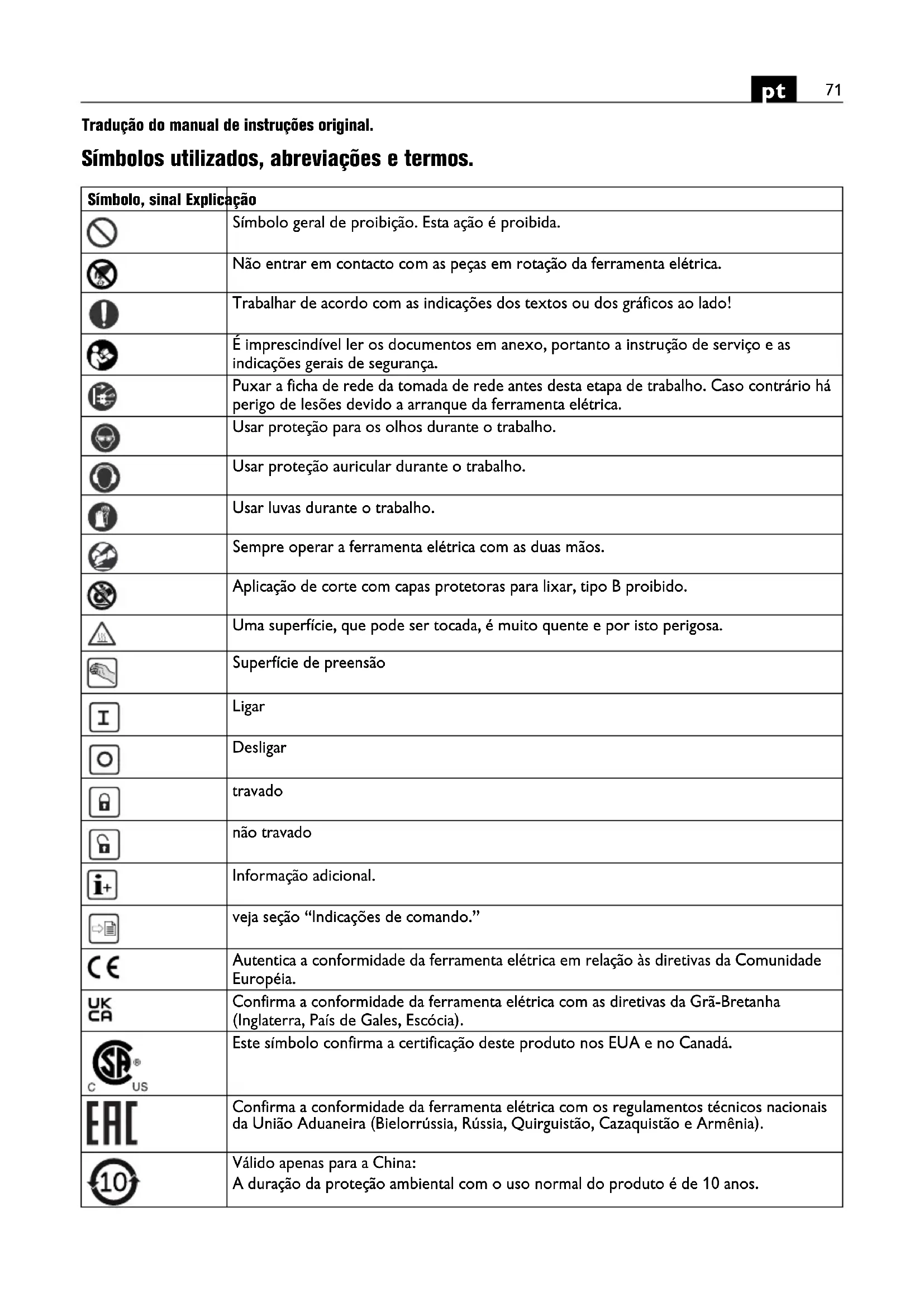 Tradução do manual de instruções original. Símbolos utilizados, abreviações e termos. Símbolo, sinal Explicação Símbolo geral de proibição. Esta ação é proibida. Não entrar em contacto com as peças em rotação da ferramenta elétrica. Trabalhar de acordo com as indicações dos textos ou dos gráficos ao lado! É imprescindível ler os documentos em anexo, portanto a instrução de serviço e as indicações gerais de segurança. Puxar a ficha de rede da tomada de rede antes desta etapa de trabalho. Caso contrário há perigo de lesões devido a arranque da ferramenta elétrica. Usar proteção para os olhos durante o trabalho. Usar proteção auricular durante o trabalho. Usar luvas durante o trabalho. Sempre operar a ferramenta elétrica com as duas mãos. Aplicação de corte com capas protetoras para lixar, tipo B proibido. Uma superfície, que pode ser tocada, é muito quente e por isto perigosa. Superfície de preensão Ligar Desligar travado não travado Informação adicional. veja seção “Indicações de comando.” Autentica a conformidade da ferramenta elétrica em relação às diretivas da Comunidade Européia. Confirma a conformidade da ferramenta elétrica com as diretivas da Grã-Bretanha (Inglaterra, País de Gales, Escócia). Este símbolo confirma a certificação deste produto nos EUA e no Canadá. Confirma a conformidade da ferramenta elétrica com os regulamentos técnicos nacionais da União Aduaneira (Bielorrússia, Rússia, Quirguistão, Cazaquistão e Armênia). Válido apenas para a China: A duração da proteção ambiental com o uso normal do produto é de 10 anos.72