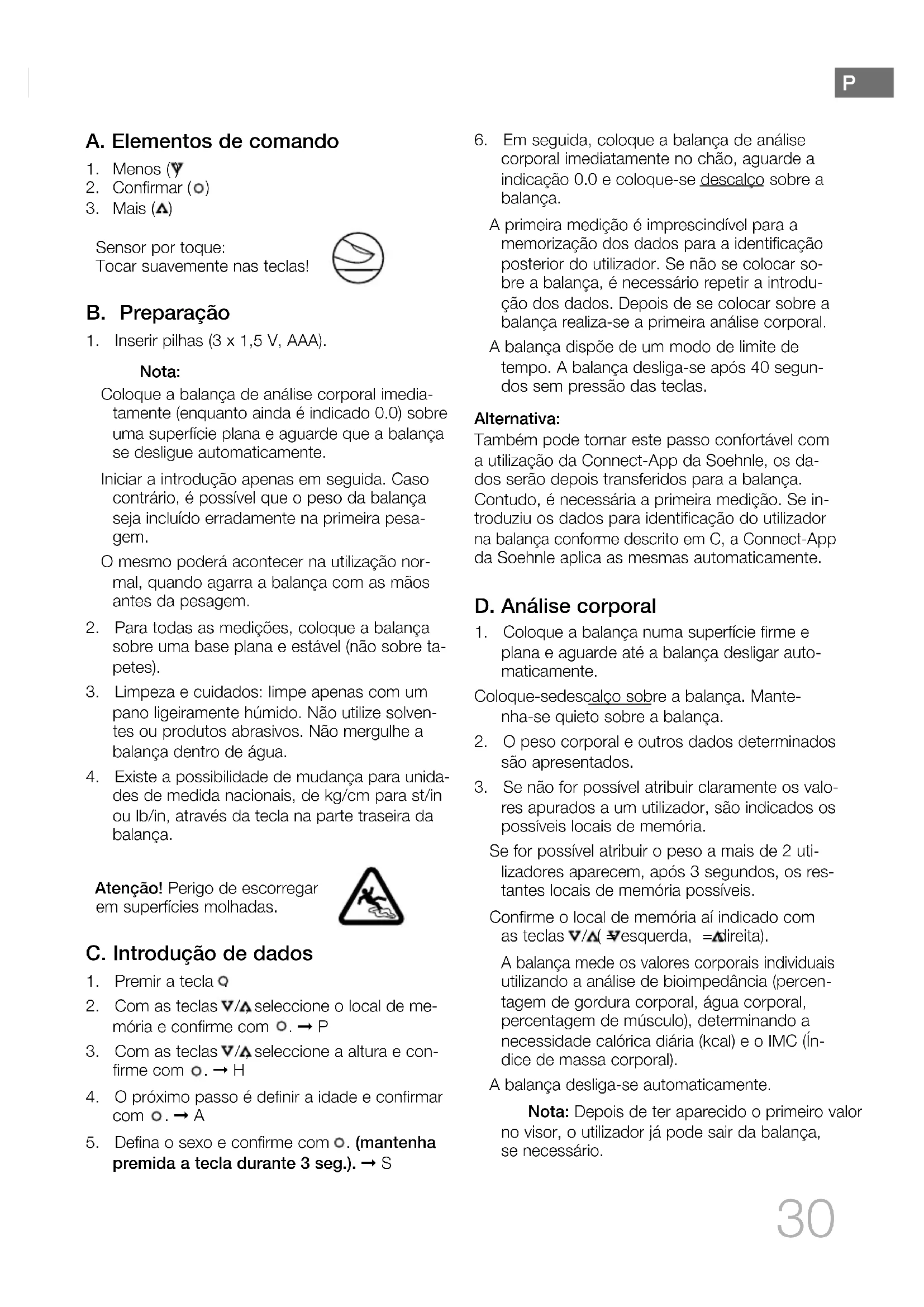 corporal imediatamente no chão, aguarde a indicação 0.0 e coloque-se descalço sobre a balança. A primeira medição é imprescindível para a memorização dos dados para a identificação posterior do utilizador. Se não se colocar so- bre a balança, é necessário repetir a introdu- ção dos dados. Depois de se colocar sobre a balança realiza-se a primeira análise corporal. A balança dispõe de um modo de limite de tempo. A balança desliga-se após 40 segun- dos sem pressão das teclas. Alternativa: Também pode tornar este passo confortável com a utilização da Connect-App da Soehnle, os da- dos serão depois transferidos para a balança. Contudo, é necessária a primeira medição. Se in- troduziu os dados para identificação do utilizador na balança conforme descrito em C, a Connect- App da Soehnle aplica as mesmas automaticamente. D. Análise corporal
