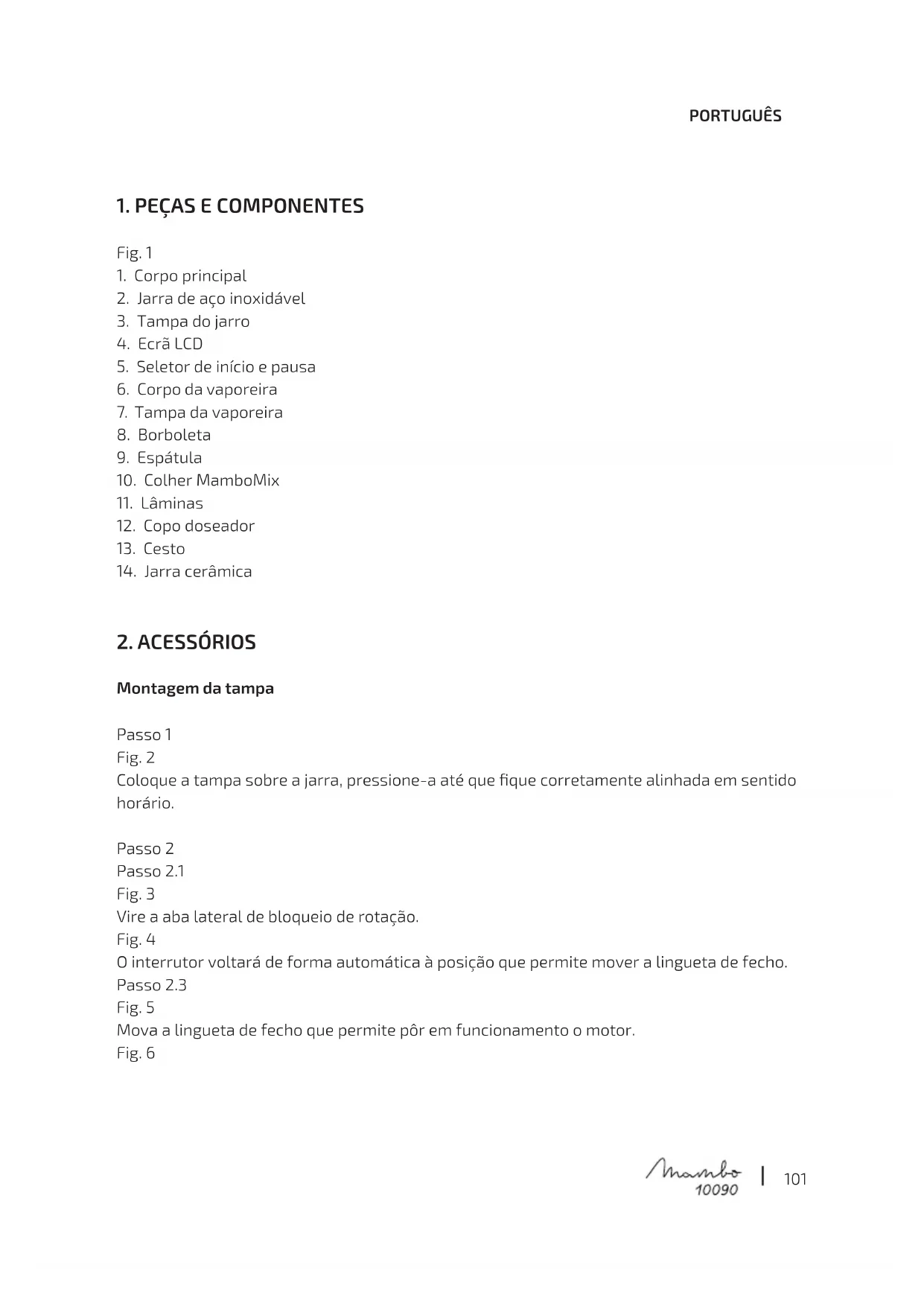 Montagem da tampa Passo 1 Fig. 2 Coloque a tampa sobre a jarra, pressione-a até que que corretamente alinhada em sentido horário. Passo 2 Passo 2.1 Fig. 3 Vire a aba lateral de bloqueio de rotação. Fig. 4 O interrutor voltará de forma automática à posição que permite mover a lingueta de fecho. Passo 2.3 Fig. 5 Mova a lingueta de fecho que permite pôr em funcionamento o motor. Fig. 6102 PORTUGUÊS Abertura da tampa Passo 1 Fig. 7 Pressione o seletor giratório para parar o motor. Passo 2 Passo 2.1 Fig. 8 Mova a lingueta de fecho que permite pôr em funcionamento o motor. Passo 2.2 Fig. 9 Pressione o interruptor para desbloquear o movimento da aba lateral. Passo 2.3 Fig. 10 Levante a aba lateral de desbloqueio de abertura. Fig. 11 Passo 3 Fig. 12 Vire a tampa em sentido anti-horário. Montagem da jarra - A jarra de aço inoxidável de alta qualidade pode ser lavada na máquina da louça e é compatível com todas as funções de cozinha. - A jarra cerâmica, de elevada anti aderência, permite conseguir resultados excelentes nas elaborações mais delicadas, como bechamel, cremes, chocolate fundido, etc. Advertência A jarra cerâmica não é compatível com as lâminas. Pode ser utilizada só com a colher MamboMix. Fig. 13 Aviso A jarra tem marcas num dos lados. A sua capacidade máxima útil é de dois litros, não exceda esta quantidade para garantir o bom funcionamento.