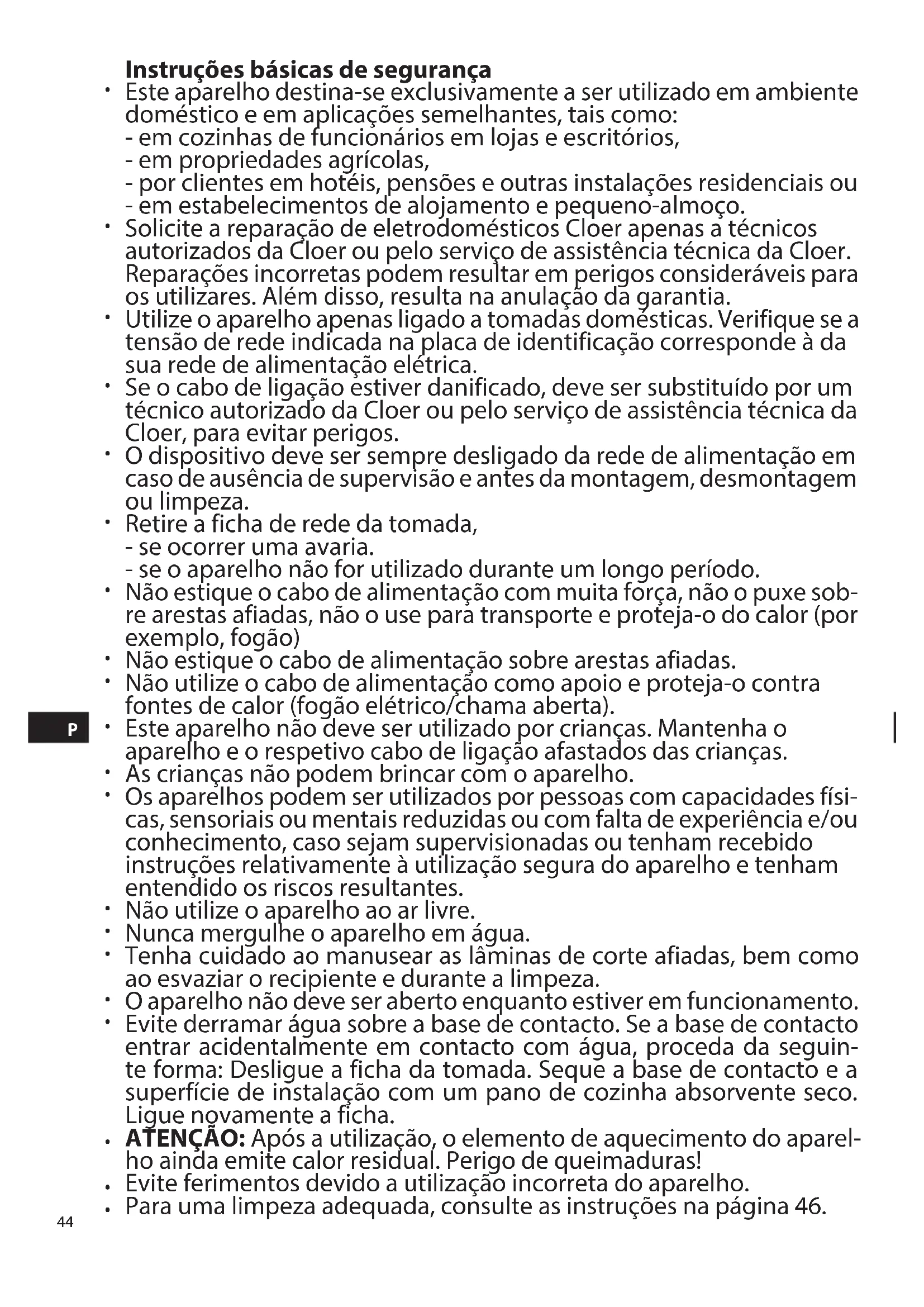 Instruções básicas de segurança Este aparelho destina-se exclusivamente a ser utilizado em ambiente doméstico e em aplicações semelhantes, tais como: - em cozinhas de funcionários em lojas e escritórios, - em propriedades agrícolas, - por clientes em hotéis, pensões e outras instalações residenciais ou - em estabelecimentos de alojamento e pequeno-almoço. Solicite a reparação de eletrodomésticos Cloer apenas a técnicos autorizados da Cloer ou pelo serviço de assistência técnica da Cloer. Reparações incorretas podem resultar em perigos consideráveis para os utilizares. Além disso, resulta na anulação da garantia. Utilize o aparelho apenas ligado a tomadas domésticas. Verifique se a tensão de rede indicada na placa de identificação corresponde à da sua rede de alimentação elétrica. Se o cabo de ligação estiver danificado, deve ser substituído por um técnico autorizado da Cloer ou pelo serviço de assistência técnica da Cloer, para evitar perigos. O dispositivo deve ser sempre desligado da rede de alimentação em caso de ausência de supervisão e antes da montagem, desmontagem ou limpeza. Retire a ficha de rede da tomada, - se ocorrer uma avaria. - se o aparelho não for utilizado durante um longo período. Não estique o cabo de alimentação com muita força, não o puxe sob- re arestas afiadas, não o use para transporte e proteja-o do calor (por exemplo, fogão) Não estique o cabo de alimentação sobre arestas afiadas. Não utilize o cabo de alimentação como apoio e proteja-o contra fontes de calor (fogão elétrico/chama aberta). Este aparelho não deve ser utilizado por crianças. Mantenha o aparelho e o respetivo cabo de ligação afastados das crianças. As crianças não podem brincar com o aparelho. Os aparelhos podem ser utilizados por pessoas com capacidades físi- cas, sensoriais ou mentais reduzidas ou com falta de experiência e/ou conhecimento, caso sejam supervisionadas ou tenham recebido instruções relativamente à utilização segura do aparelho e tenham entendido os riscos resultantes. Não utilize o aparelho ao ar livre. Nunca mergulhe o aparelho em água. Tenha cuidado ao manusear as lâminas de corte afiadas, bem como ao esvaziar o recipiente e durante a limpeza. O aparelho não deve ser aberto enquanto estiver em funcionamento. Evite derramar água sobre a base de contacto. Se a base de contacto entrar acidentalmente em contacto com água, proceda da seguin- te forma: Desligue a ficha da tomada. Seque a base de contacto e a superfície de instalação com um pano de cozinha absorvente seco. Ligue novamente a ficha. ATENÇÃO: Após a utilização, o elemento de aquecimento do aparel- ho ainda emite calor residual. Perigo de queimaduras! Evite ferimentos devido a utilização incorreta do aparelho. Para uma limpeza adequada, consulte as instruções na página 46.