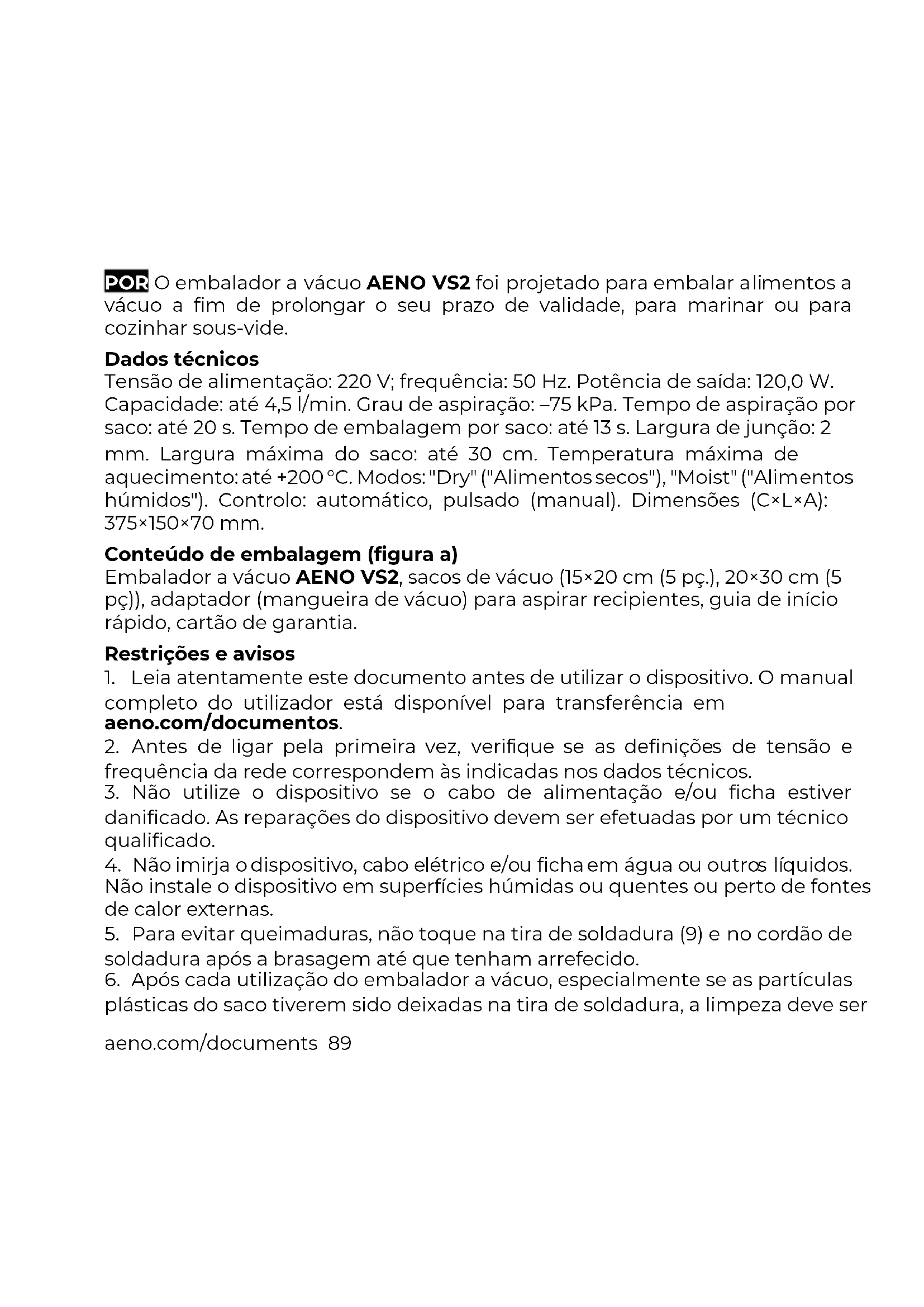 plásticas do saco tiverem sido deixadas na tira de soldadura, a limpeza deve ser90 aeno.com/documents efetuada. Desligue o dispositivo puxando a ficha da tomada e deixe-o arrefecer. Limpe a superfície do dispositivo com um pano macio embebido em água morna ou uma solução de sabão suave. Em seguida, limpe com um pano macio humedecido com água limpa e seque. Não utilize detergentes agressivos, pastas abrasivas, polidores ou detergentes que contenham ácidos ou solventes.