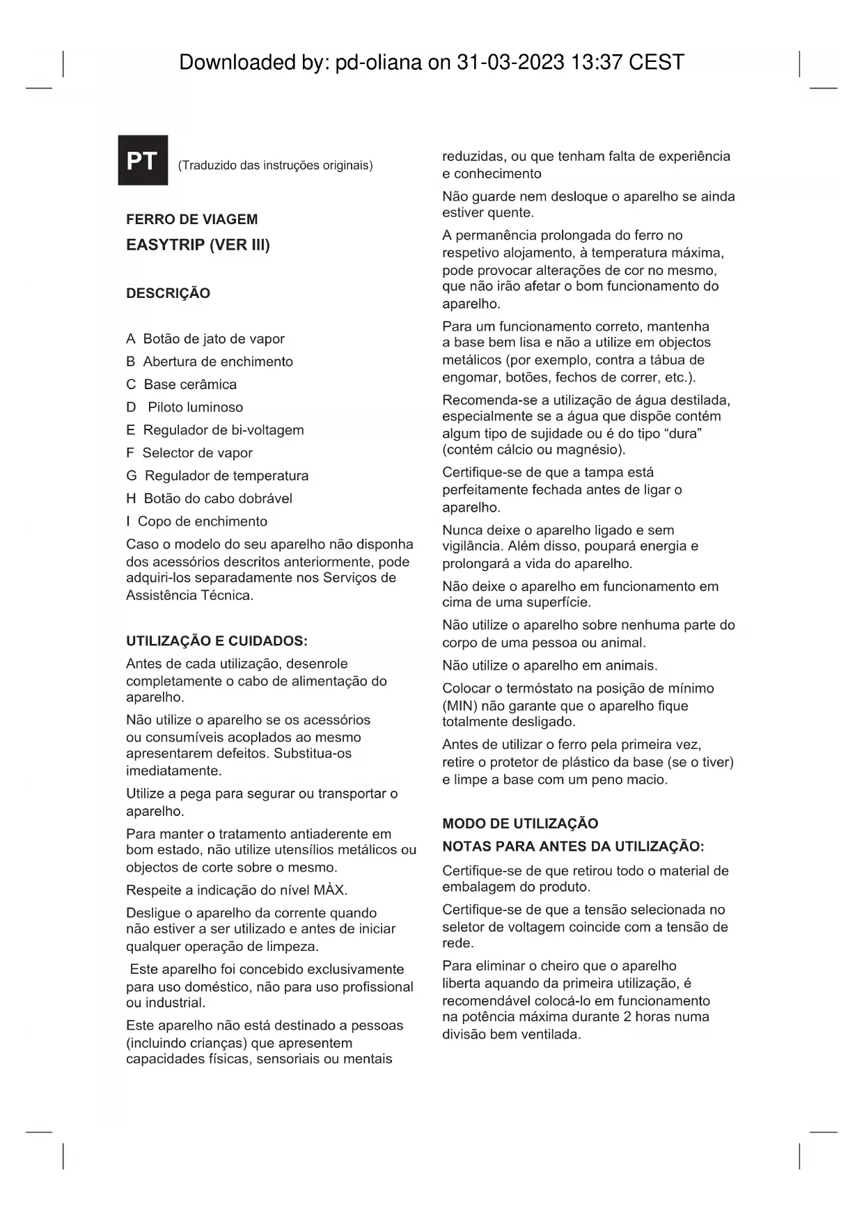 TARTRE : Pour un parfait fonctionnement de l’appareil, celui-ci doit être libre de toute incrustation de calcaire ou magnésium résultant de l’utilisation d’eau trop dure. Pour éviter ce type de problème, l'utilisation d'eau distillée ou puriée est recommandée. S’il n’était pas possible d’utiliser le type d’eau recommandé antérieurement, vous devrez procéder régulièrement à un détartrage de l’appareil, à la fréquence suivante : Toutes les 6 semaines si l’eau est « très dure ». Toutes les 12 semaines en cas d’eau « dure ». Pour cela, nous vous recommandons le produit spécique en vente dans les magasins spécialisés et services techniques autorisés. Downloaded by: pd-oliana on 31-03-2023 13:37 CESTFERRO DE VIAGEM EASYTRIP (VER III) DESCRIÇÃO A Botão de jato de vapor B Abertura de enchimento C Base cerâmica D Piloto luminoso E Regulador de bi-voltagem F Selector de vapor G Regulador de temperatura H Botão do cabo dobrável I Copo de enchimento Caso o modelo do seu aparelho não disponha dos acessórios descritos anteriormente, pode adquiri-los separadamente nos Serviços de Assistência Técnica. UTILIZAÇÃO E CUIDADOS: Antes de cada utilização, desenrole completamente o cabo de alimentação do aparelho. Não utilize o aparelho se os acessórios ou consumíveis acoplados ao mesmo apresentarem defeitos. Substitua-os imediatamente. Utilize a pega para segurar ou transportar o aparelho. Para manter o tratamento antiaderente em bom estado, não utilize utensílios metálicos ou objectos de corte sobre o mesmo. Respeite a indicação do nível MÀX. Desligue o aparelho da corrente quando não estiver a ser utilizado e antes de iniciar qualquer operação de limpeza. Este aparelho foi concebido exclusivamente para uso doméstico, não para uso prossional ou industrial. Este aparelho não está destinado a pessoas (incluindo crianças) que apresentem capacidades físicas, sensoriais ou mentais reduzidas, ou que tenham falta de experiência e conhecimento Não guarde nem desloque o aparelho se ainda estiver quente. A permanência prolongada do ferro no respetivo alojamento, à temperatura máxima, pode provocar alterações de cor no mesmo, que não irão afetar o bom funcionamento do aparelho. Para um funcionamento correto, mantenha a base bem lisa e não a utilize em objectos metálicos (por exemplo, contra a tábua de engomar, botões, fechos de correr, etc.). Recomenda-se a utilização de água destilada, especialmente se a água que dispõe contém algum tipo de sujidade ou é do tipo “dura” (contém cálcio ou magnésio). Certique-se de que a tampa está perfeitamente fechada antes de ligar o aparelho. Nunca deixe o aparelho ligado e sem vigilância. Além disso, poupará energia e prolongará a vida do aparelho. Não deixe o aparelho em funcionamento em cima de uma superfície. Não utilize o aparelho sobre nenhuma parte do corpo de uma pessoa ou animal. Não utilize o aparelho em animais. Colocar o termóstato na posição de mínimo (MIN) não garante que o aparelho que totalmente desligado. Antes de utilizar o ferro pela primeira vez, retire o protetor de plástico da base (se o tiver) e limpe a base com um peno macio.