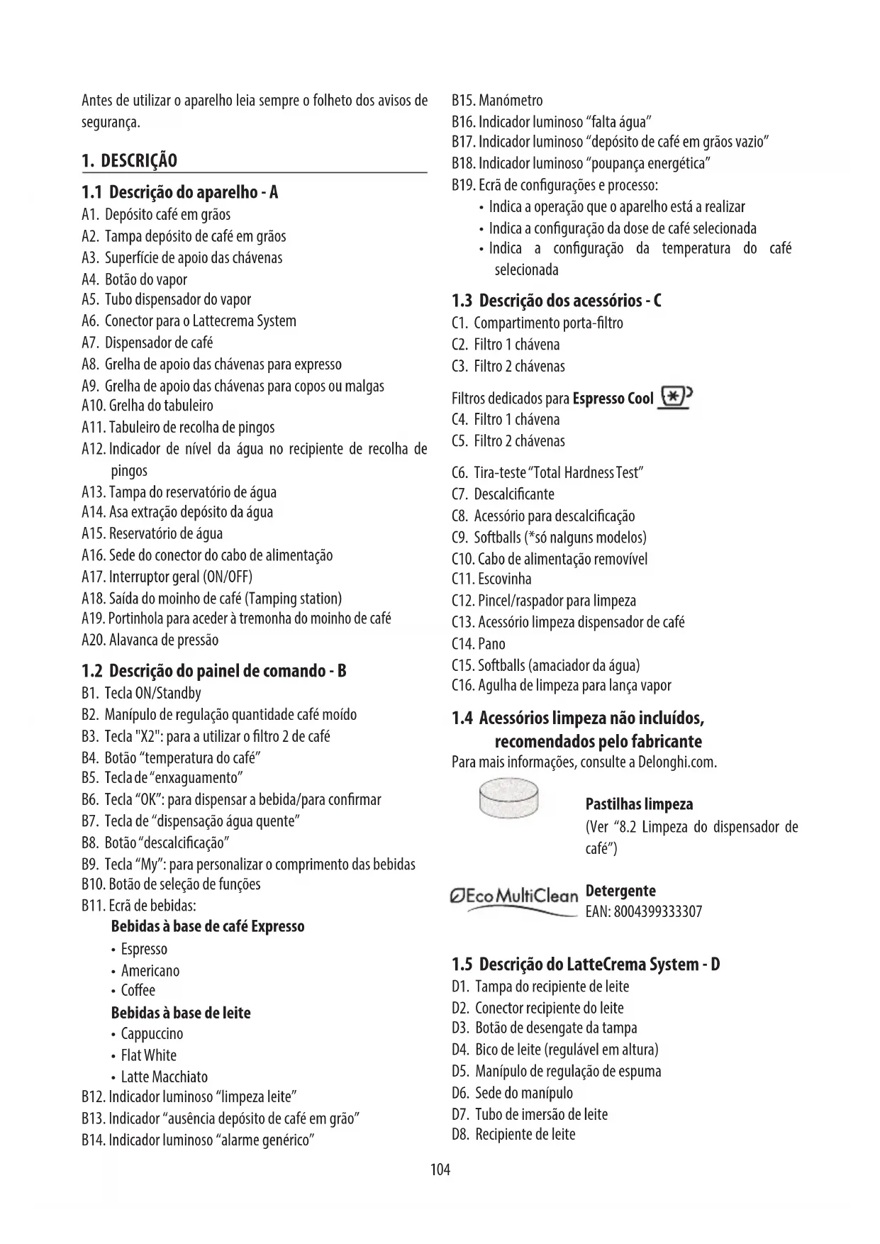 - Recomenda-se utilizar exclusivamente o descalcicante De’Longhi. O uso de descalcicantes inadequados, assim como a descalcicação não realizada regulamente, pode comportar o surgimento de defeitos não cobertos pela ga- rantia do fabricante.