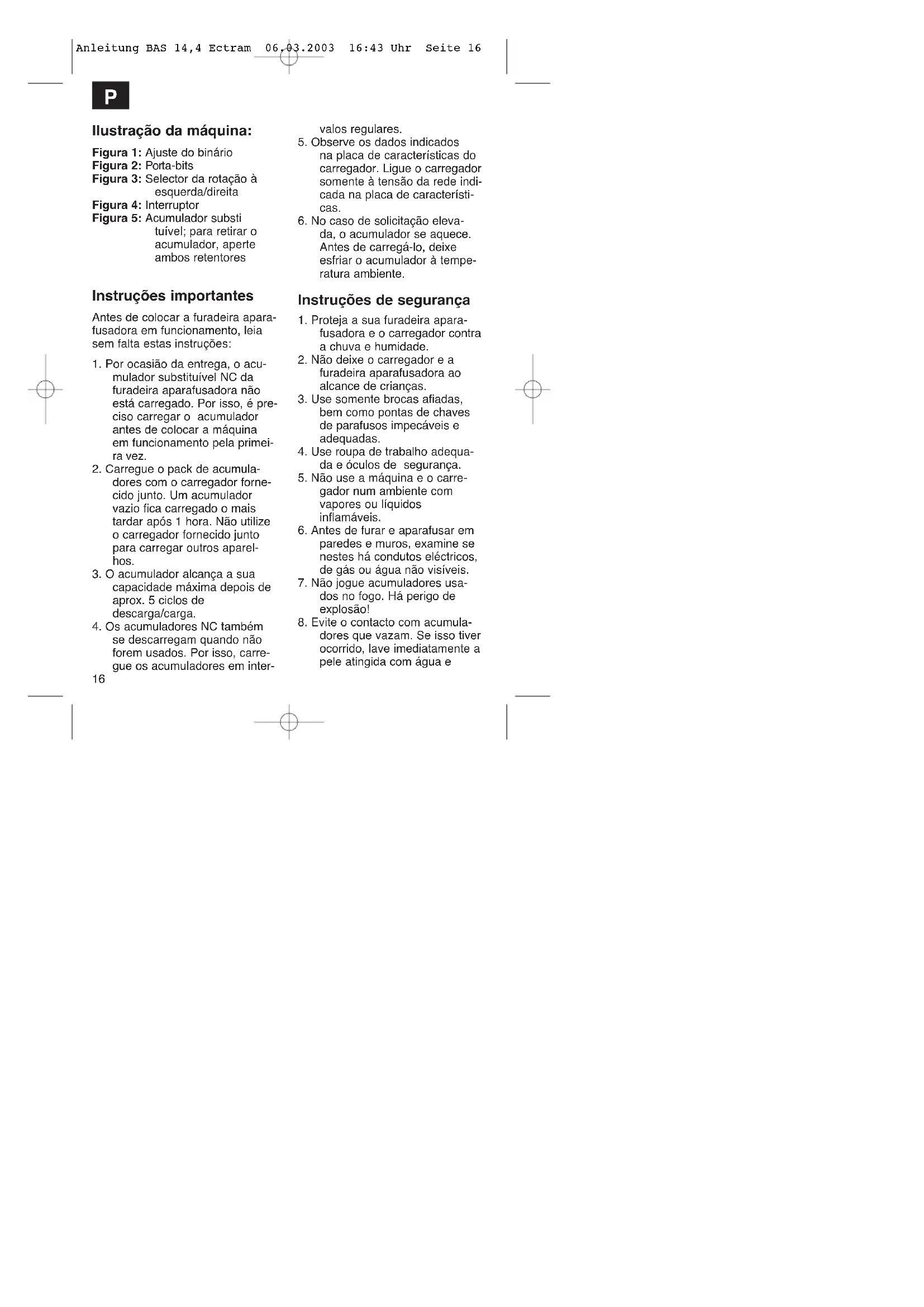 dores no carregador. O díodo luminoso vermelho aceso sig- nifica que o pack de acumula- dores está a ser carregado. Quando o díodo luminoso verde acende significa que o processo de carga terminou. O tempo de carga dura 1 hora, com o acumulador totalmente descarregado. O pack de acu- muladores poderá aquecer lig- eiramente durante a carga o que é perfeitamente normal. Se não for possível carregar o acu- mulador, queira examinar: se a tensão da rede está dis- ponível na tomada se há um contacto perfeito nos pontos de contacto do aparelho carre- gador. Se ainda não for possível carregar o acumulador, solicitamos enviar o aparelho carregador e o acumulador ao nosso serviço de assistência técnica. Para assegurar uma longa duração do acumulador, deve-se recarregá- lo em tempo. Isso é necessário em todo caso quando V.S. verificar que o rendimento da furadeira aparafu- sadora diminui. Nunca descarregue completamen- te o acumulador. Isso causa um Anleitung BAS 14,4 Ectram 06.03.2003 16:43 Uhr Seite 1718