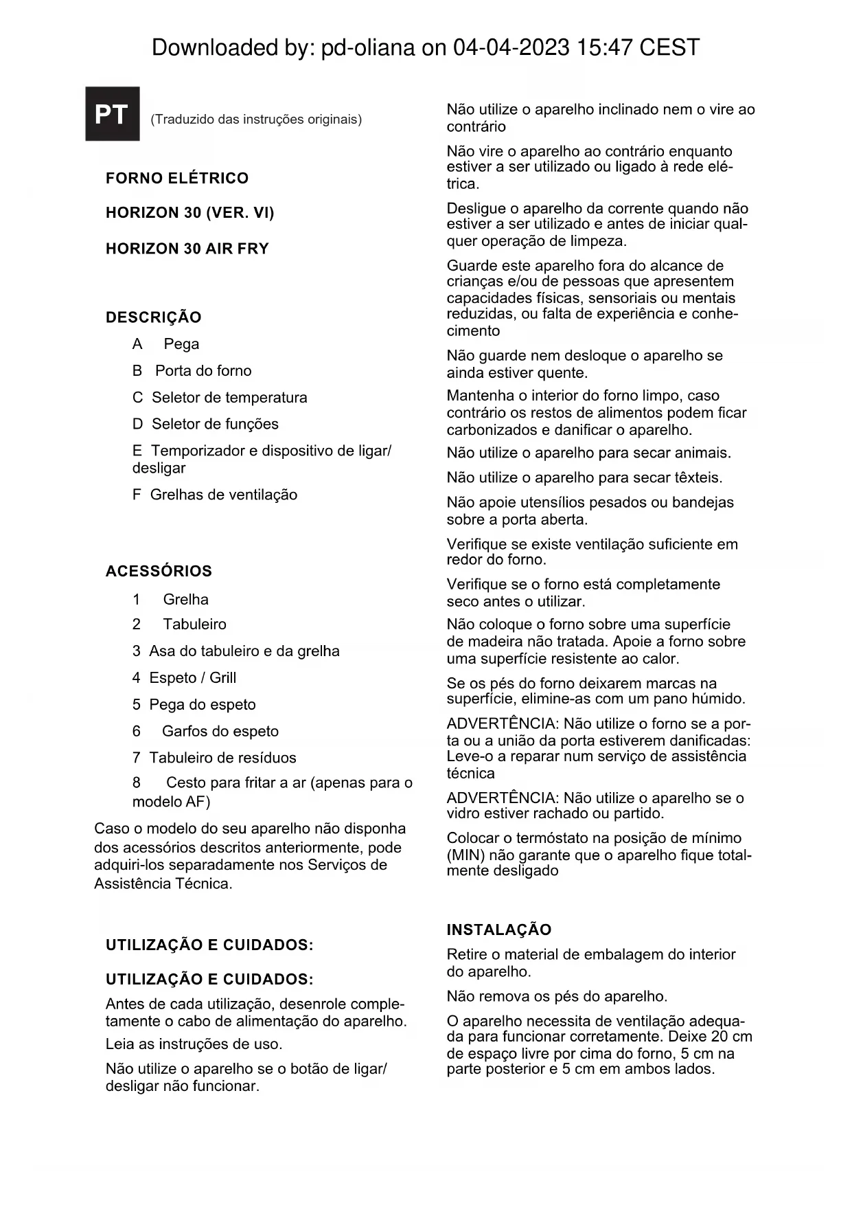 DESCRIÇÃO A Pega B Porta do forno C Seletor de temperatura D Seletor de funções E Temporizador e dispositivo de ligar/ desligar F Grelhas de ventilação ACESSÓRIOS 1 Grelha 2 Tabuleiro 3 Asa do tabuleiro e da grelha 4 Espeto / Grill 5 Pega do espeto 6 Garfos do espeto 7 Tabuleiro de resíduos 8 Cesto para fritar a ar (apenas para o modelo AF) Caso o modelo do seu aparelho não disponha dos acessórios descritos anteriormente, pode adquiri-los separadamente nos Serviços de Assistência Técnica. UTILIZAÇÃO E CUIDADOS: UTILIZAÇÃO E CUIDADOS: Antes de cada utilização, desenrole comple- tamente o cabo de alimentação do aparelho. Leia as instruções de uso. Não utilize o aparelho se o botão de ligar/ desligar não funcionar. Não utilize o aparelho inclinado nem o vire ao contrário Não vire o aparelho ao contrário enquanto estiver a ser utilizado ou ligado à rede elé- trica. Desligue o aparelho da corrente quando não estiver a ser utilizado e antes de iniciar qual- quer operação de limpeza. Guarde este aparelho fora do alcance de crianças e/ou de pessoas que apresentem capacidades físicas, sensoriais ou mentais reduzidas, ou falta de experiência e conhe- cimento Não guarde nem desloque o aparelho se ainda estiver quente. Mantenha o interior do forno limpo, caso contrário os restos de alimentos podem car carbonizados e danicar o aparelho. Não utilize o aparelho para secar animais. Não utilize o aparelho para secar têxteis. Não apoie utensílios pesados ou bandejas sobre a porta aberta. Verique se existe ventilação suciente em redor do forno. Verique se o forno está completamente seco antes o utilizar. Não coloque o forno sobre uma superfície de madeira não tratada. Apoie a forno sobre uma superfície resistente ao calor. Se os pés do forno deixarem marcas na superfície, elimine-as com um pano húmido. ADVERTÊNCIA: Não utilize o forno se a por- ta ou a união da porta estiverem danicadas: Leve-o a reparar num serviço de assistência técnica ADVERTÊNCIA: Não utilize o aparelho se o vidro estiver rachado ou partido. Colocar o termóstato na posição de mínimo (MIN) não garante que o aparelho que total- mente desligado INSTALAÇÃO Retire o material de embalagem do interior do aparelho. Não remova os pés do aparelho. O aparelho necessita de ventilação adequa- da para funcionar corretamente. Deixe 20 cm de espaço livre por cima do forno, 5 cm na parte posterior e 5 cm em ambos lados. PT (Traduzido das instruções originais) Downloaded by: pd-oliana on 04-04-2023 15:47 CESTINSTRUÇÕES DE UTILIZAÇÃO ANTES DA PRIMEIRA UTILIZAÇÃO: Certique-se de que retirou o material de embalagem do produto Antes de utilizar o produto pela primeira vez, limpe as partes em contacto com os alimentos tal como se descreve no capítulo de limpeza. UTILIZAÇÃO: Ligue o aparelho à corrente elétrica. Selecione a temperatura através do seletor de temperatura. (C) Selecione a função com o seletor de funções (D) SELETOR DE FUNÇÕES (D) ► Desligado ► Cozinhar com convecção. Esta função permite cozinhar com as resistências inferior e superior, manter uma temperatura uniforme e encurtar o tempo de confeção graças ao ar de convecção. ► Grill com convecção. Utilize esta fun- ção para gratinar os alimentos enquanto a convecção distribuir o calor pelos próprios alimentos. ► Cozinhar de modo tradicional. Selecio- ne esta função para cozinhar os alimentos de maneira tradicional. ► Grill / Grill e assar. Utilize esta função para gratinar os alimentos de maneira tradi- cional ou utilize também o espeto para usar o calor superior com o espeto. ► Grill (espeto) com convecção. Selecio- ne esta função para cozinhar os alimentos assando-os no espeto e cozinhe-os com a ajuda da convecção. Utilize também esta função para fritar os alimentos com a ajuda do cesto AIR FRY.