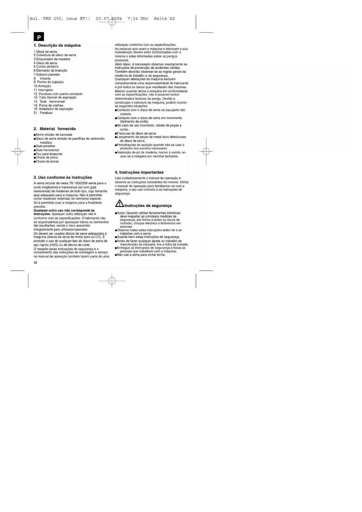 Leia cuidadosamente o manual de operação e observe as instruções constantes do mesmo. Utilize o manual de operação para familiarizar-se com a máquina, o seu uso correcto e as instruções de segurança. Instruções de segurança Aviso: Quando utilizar ferramentas eléctricas deve respeitar as principais medidas de segurança, por forma a evitar os riscos de incêndio, choque eléctrico e ferimentos em pessoas. Observe todas estas instruções antes de e ao trabalhar com a serra. Guarde bem estas instruções de segurança. Antes de fazer qualquer ajuste ou trabalho de manutenção na máquina, tire a ficha da tomada. Entregue as instruções de segurança a todas as pessoas que trabalham com a máquina. Não use a serra para cortar lenha. Anl. TKS 250, neue ET!! 20.07.2004 7:34 Uhr Seite 4243