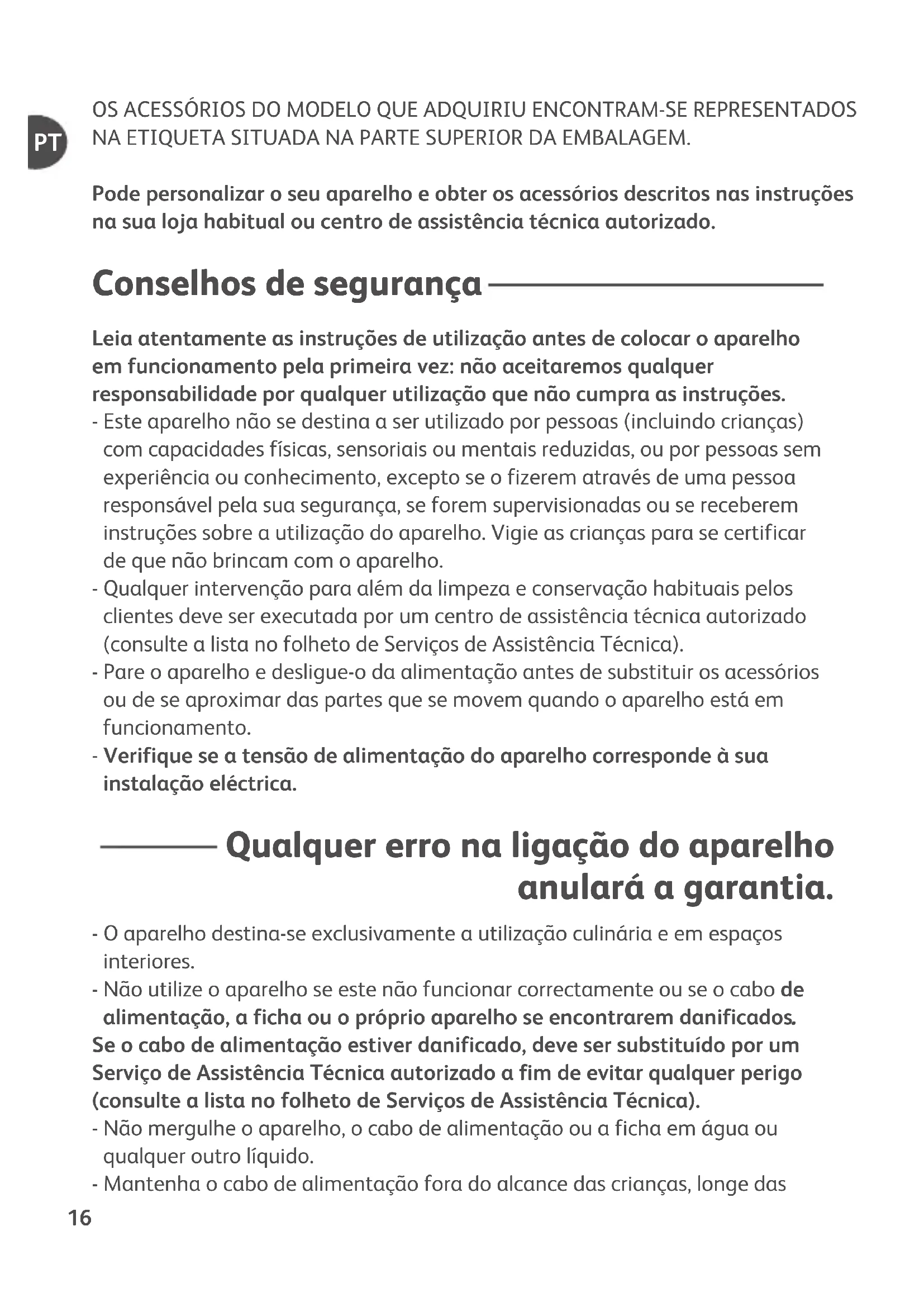 Sugerencias En caso de coloración de los accesorios por la acción de alimentos (zanahorias, naranjas, etc.), frótelos con un trapo empapado en aceite de uso alimenticio y, a continuación, proceda con la limpieza habitual. ¿Qué hacer si el aparato no funciona? Si el aparato no funciona, compruebe: - La conexión del aparato. - El correcto bloqueo de cada accesorio. ¿Su aparato sigue sin funcionar? Diríjase a un centro de servicio oficial (consulte la lista en el folleto de servicio). Productos electrónicos al final de su vida ¡Contribuyamos a proteger el medio ambiente! Su aparato contiene numerosos materiales recuperables o reciclables. Llévelo a un centro de recogida de residuos para su procesamiento. Eliminación de los materiales de embalaje y del aparato El embalaje está exclusivamente compuesto por materiales inocuos para el medio ambiente que pueden eliminarse con arreglo a la normativa de reciclaje vigente. Para deshacerse del aparato, contacte con el servicio correspondiente de su municipio.OS ACESSÓRIOS DO MODELO QUE ADQUIRIU ENCONTRAM-SE REPRESENTADOS NA ETIQUETA SITUADA NA PARTE SUPERIOR DA EMBALAGEM. Pode personalizar o seu aparelho e obter os acessórios descritos nas instruções na sua loja habitual ou centro de assistência técnica autorizado. Conselhos de segurança Leia atentamente as instruções de utilização antes de colocar o aparelho em funcionamento pela primeira vez: não aceitaremos qualquer responsabilidade por qualquer utilização que não cumpra as instruções. - Este aparelho não se destina a ser utilizado por pessoas (incluindo crianças) com capacidades físicas, sensoriais ou mentais reduzidas, ou por pessoas sem experiência ou conhecimento, excepto se o fizerem através de uma pessoa responsável pela sua segurança, se forem supervisionadas ou se receberem instruções sobre a utilização do aparelho. Vigie as crianças para se certificar de que não brincam com o aparelho. - Qualquer intervenção para além da limpeza e conservação habituais pelos clientes deve ser executada por um centro de assistência técnica autorizado (consulte a lista no folheto de Serviços de Assistência Técnica). - Pare o aparelho e desligue-o da alimentação antes de substituir os acessórios ou de se aproximar das partes que se movem quando o aparelho está em funcionamento. - Verifique se a tensão de alimentação do aparelho corresponde à sua instalação eléctrica. Qualquer erro na ligação do aparelho anulará a garantia. - O aparelho destina-se exclusivamente a utilização culinária e em espaços interiores. - Não utilize o aparelho se este não funcionar correctamente ou se o cabo de alimentação, a ficha ou o próprio aparelho se encontrarem danificados